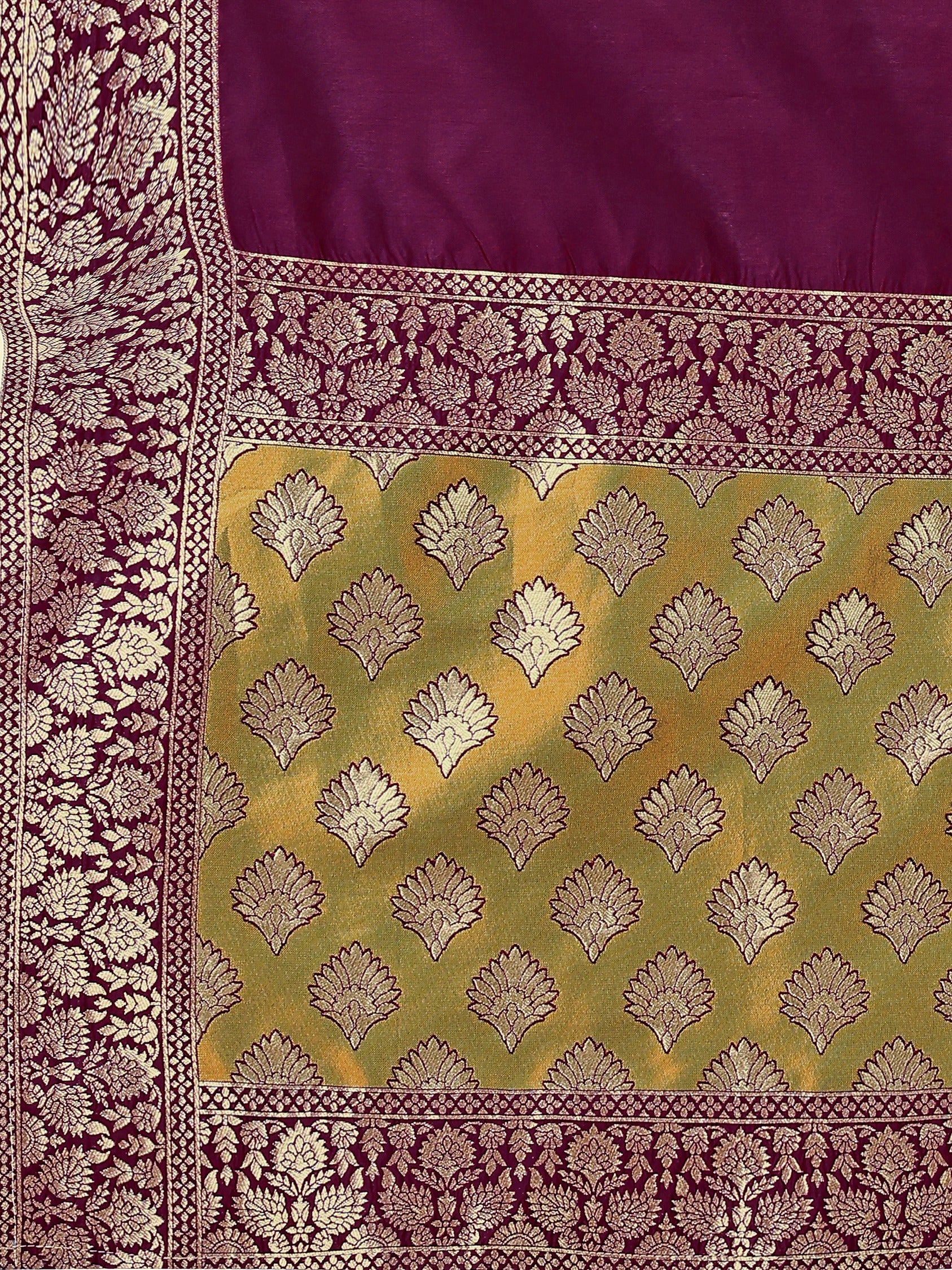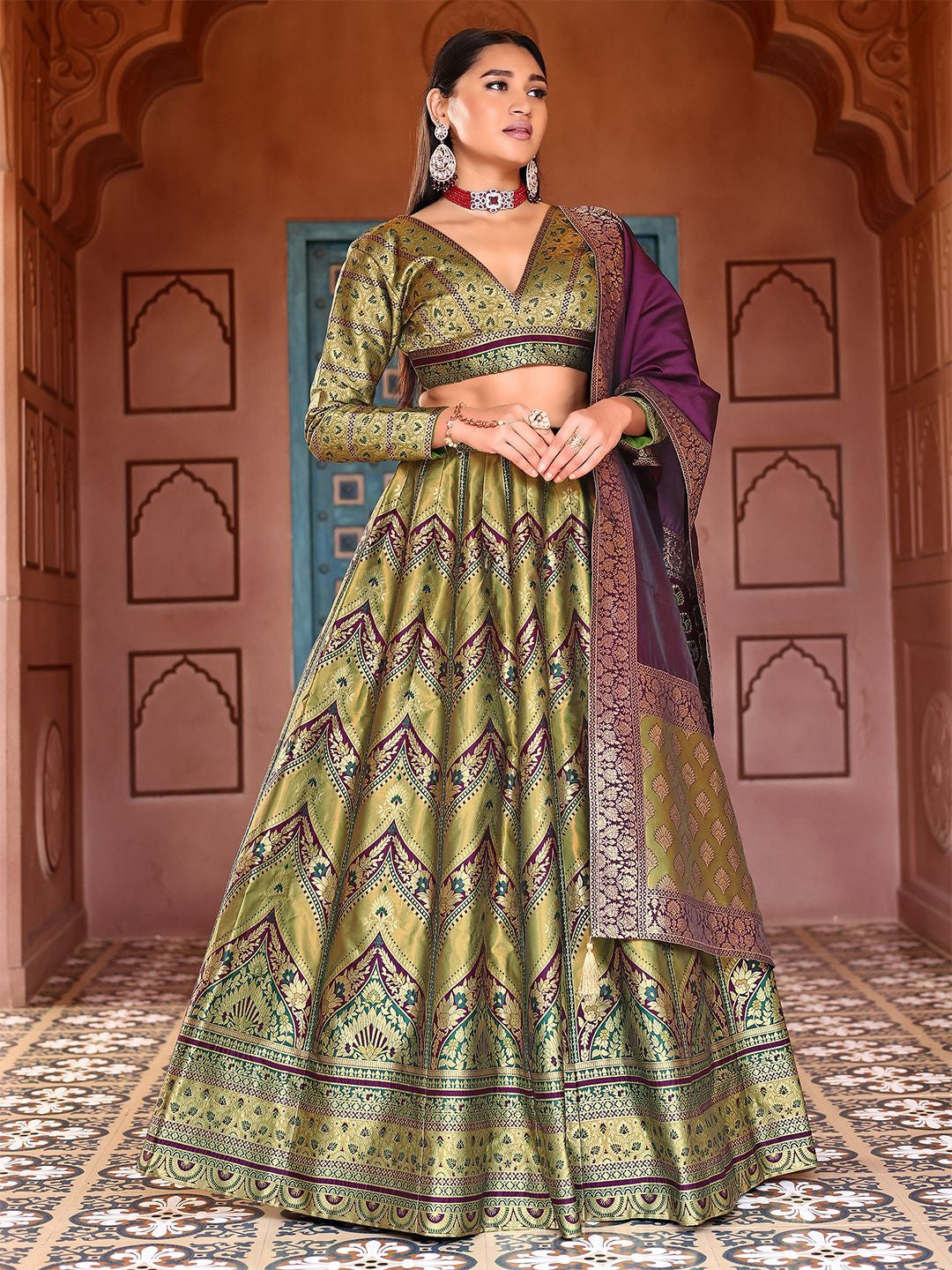 Step into elegance with this Royal Olive Green & Maroon Banarasi Silk Lehenga Set. Designed with exquisite zari weaving and traditional motifs, this ensemble radiates timeless charm. The lehenga features a rich brocade pattern and is paired with a deep V-neck blouse, complemented by a contrasting maroon silk dupatta with intricate border work.