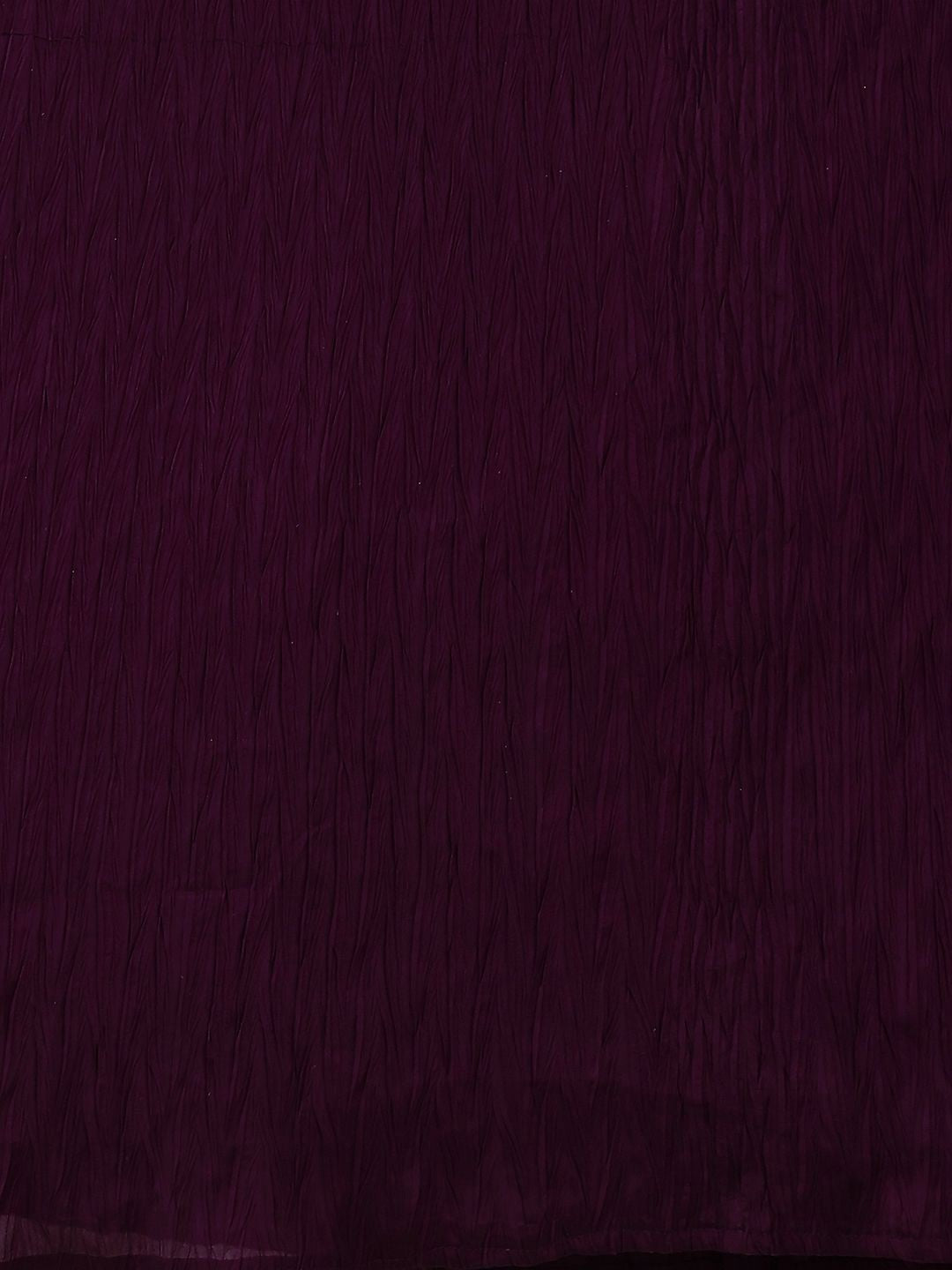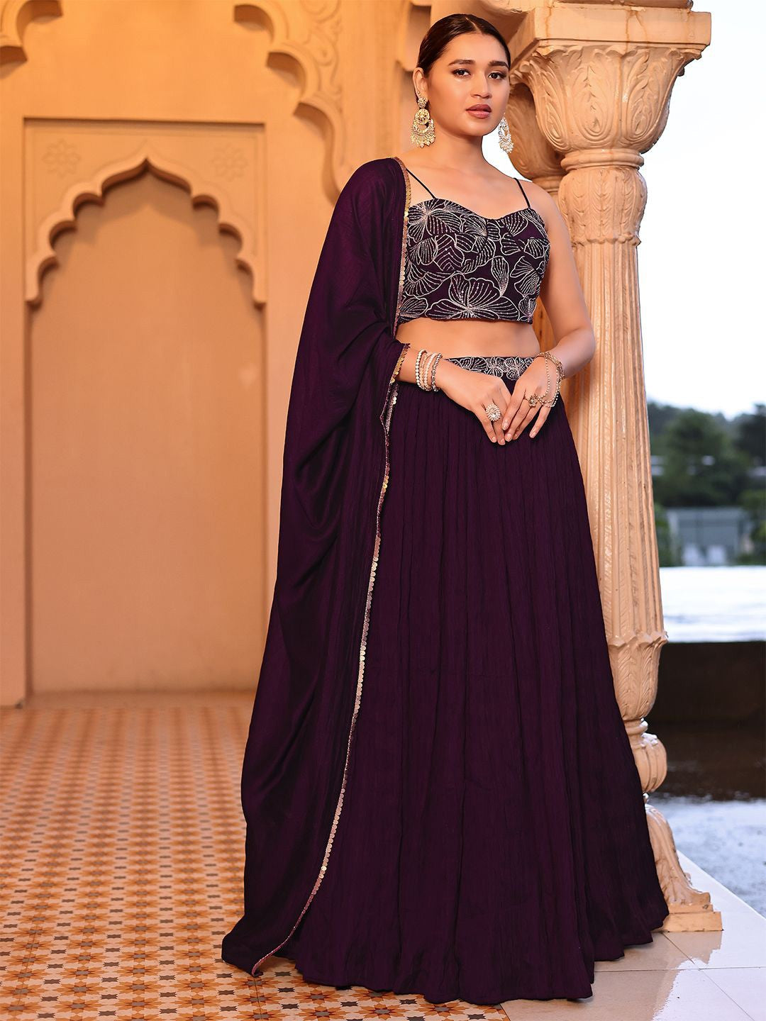 Elevate your ethnic wardrobe with this stunning royal plum lehenga set. Crafted from premium georgette fabric, the ensemble features a beautifully embroidered blouse with delicate silver threadwork and spaghetti straps, paired with a flowing, pleated lehenga skirt.