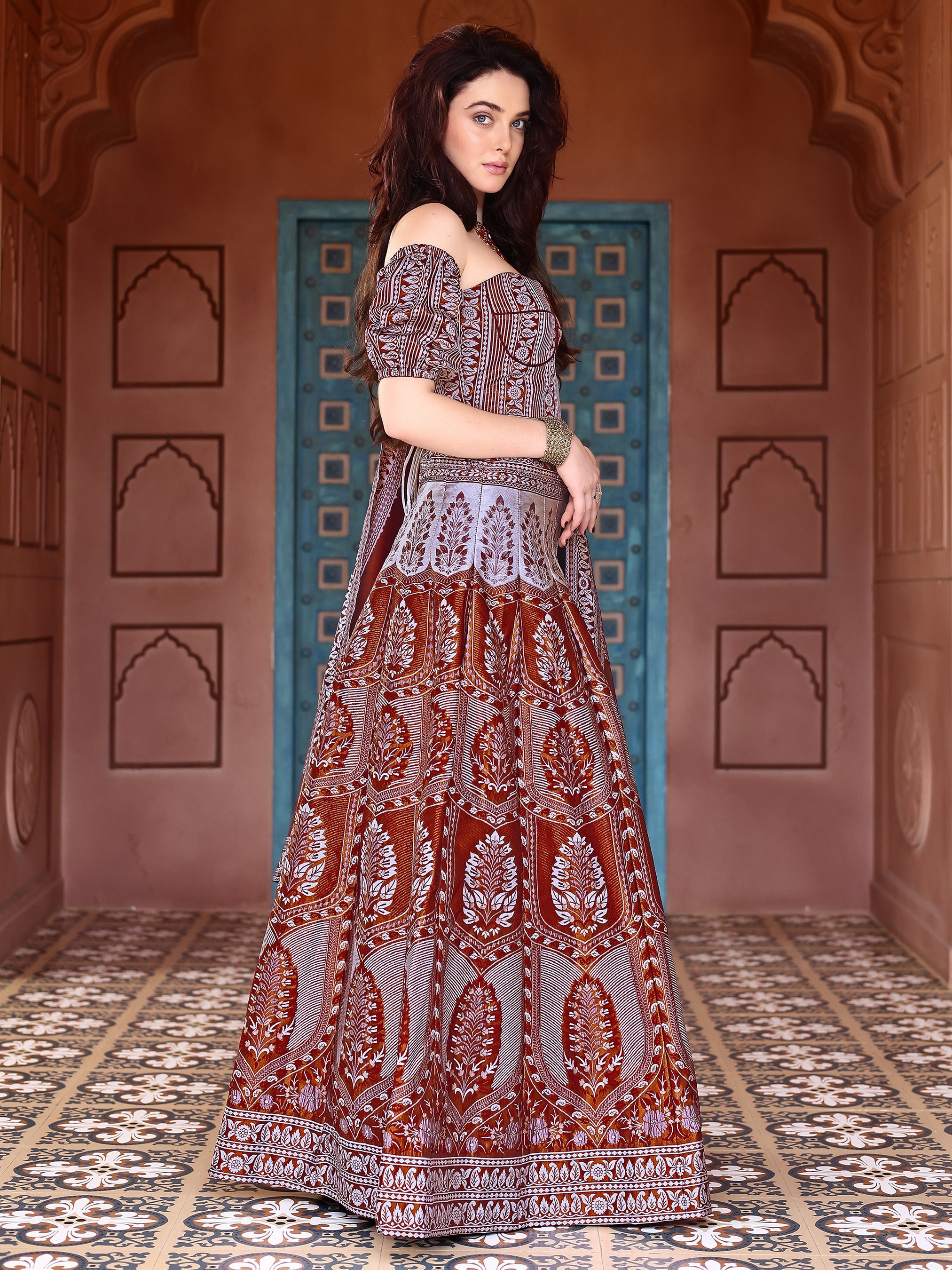 Celebrate heritage craftsmanship in this Rust and Lavender Ajrakh Print Lehenga Set, where timeless tradition meets a flattering modern silhouette. Adorned in intricate folk motifs, this set features a richly detailed lehenga skirt, a bustier-style blouse with puff sleeves, and a coordinating Ajrakh printed dupatta to complete the look.