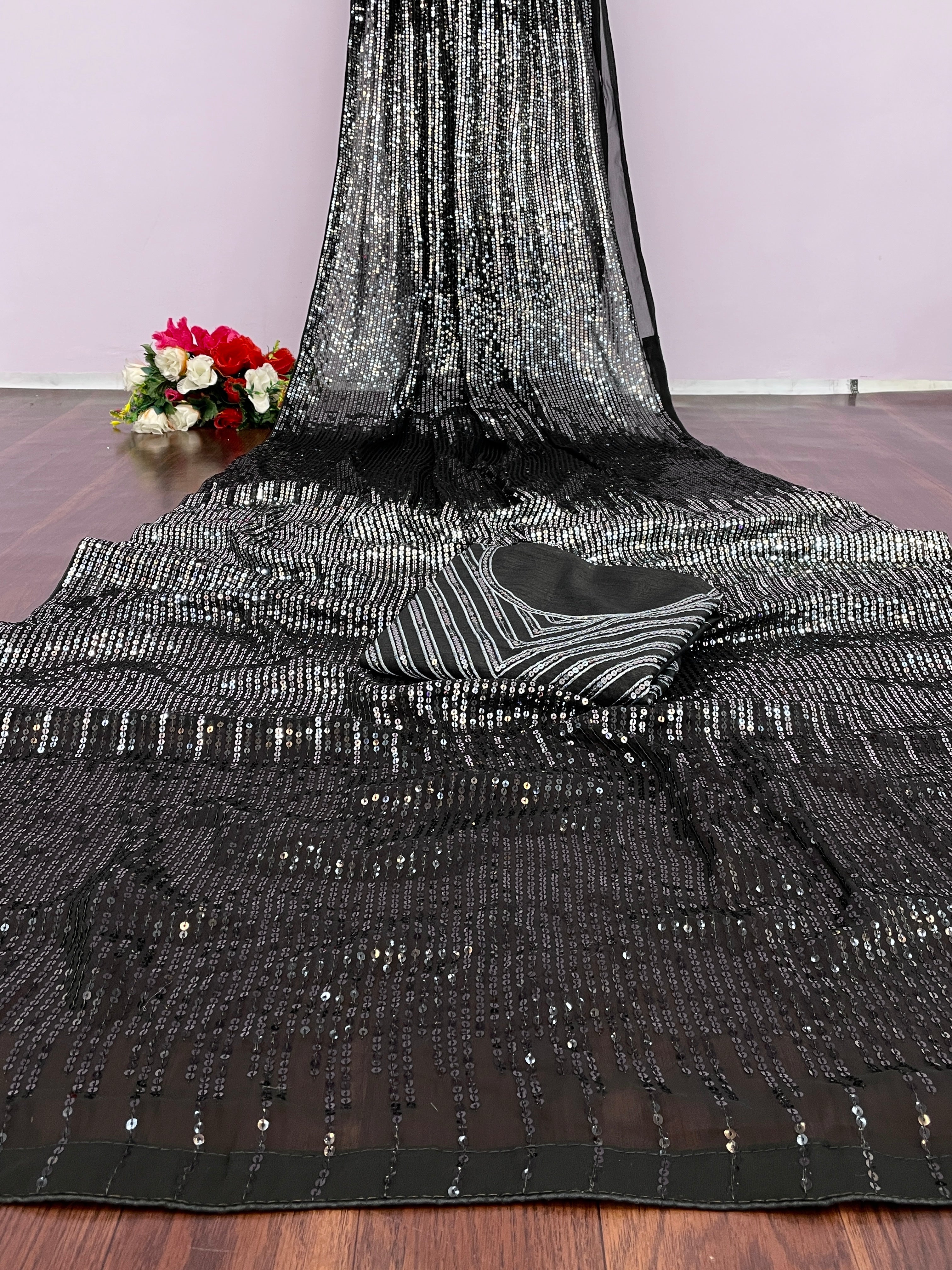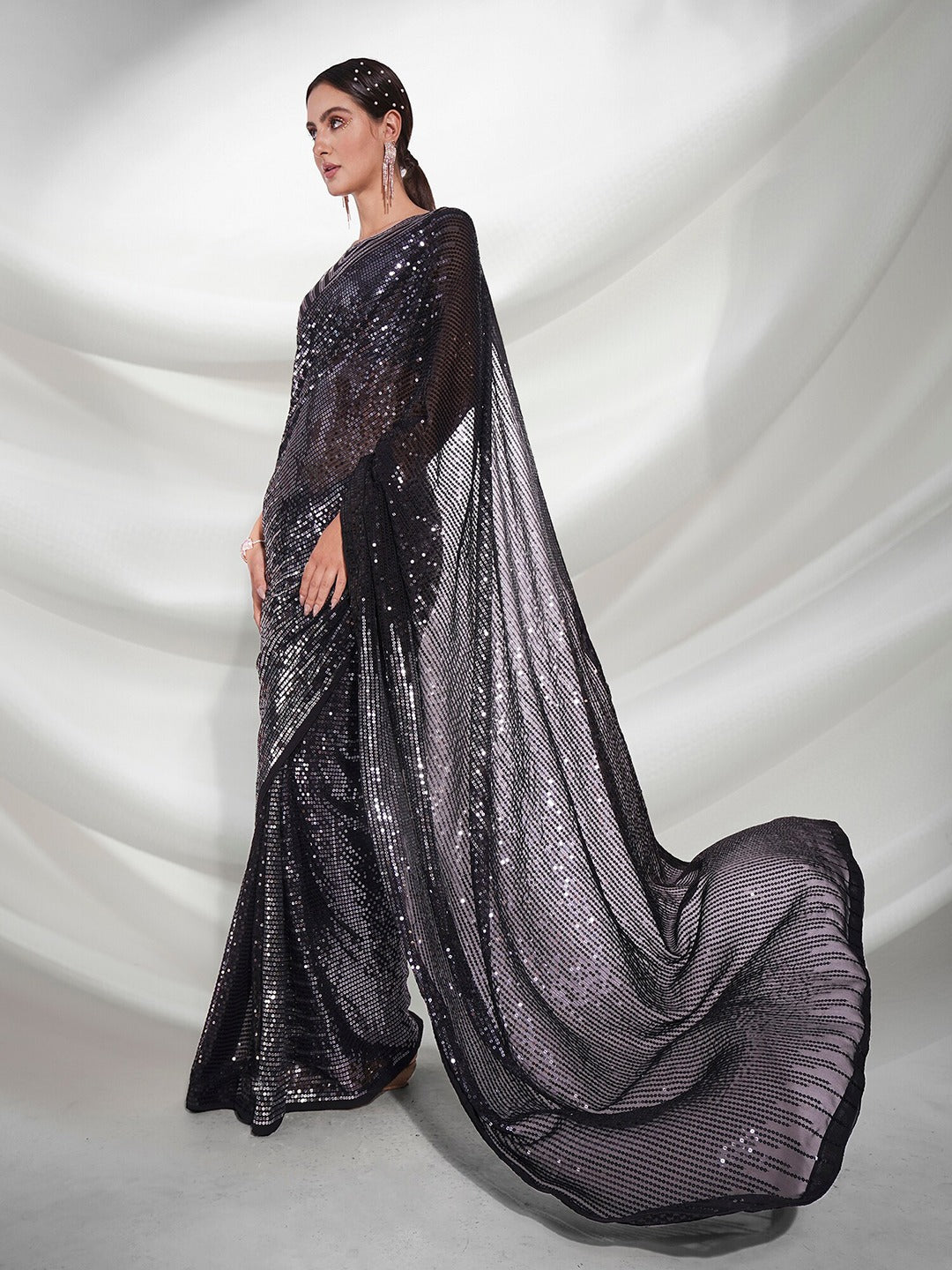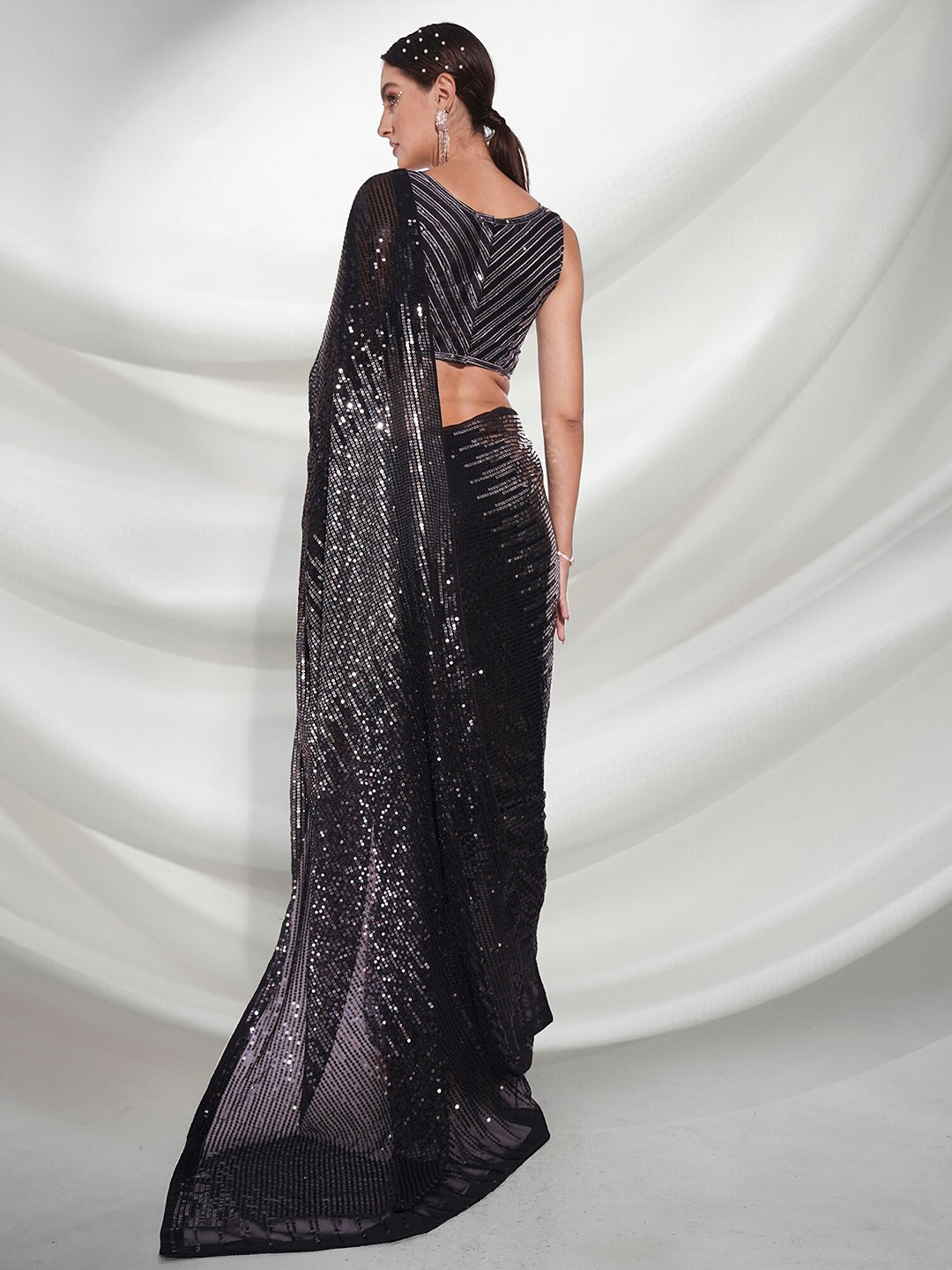 Experience the allure of midnight glam with this bold and captivating black sequin saree. Featuring intricate horizontal and diagonal sequin detailing across a body-hugging silhouette, this saree is the epitome of evening elegance.
