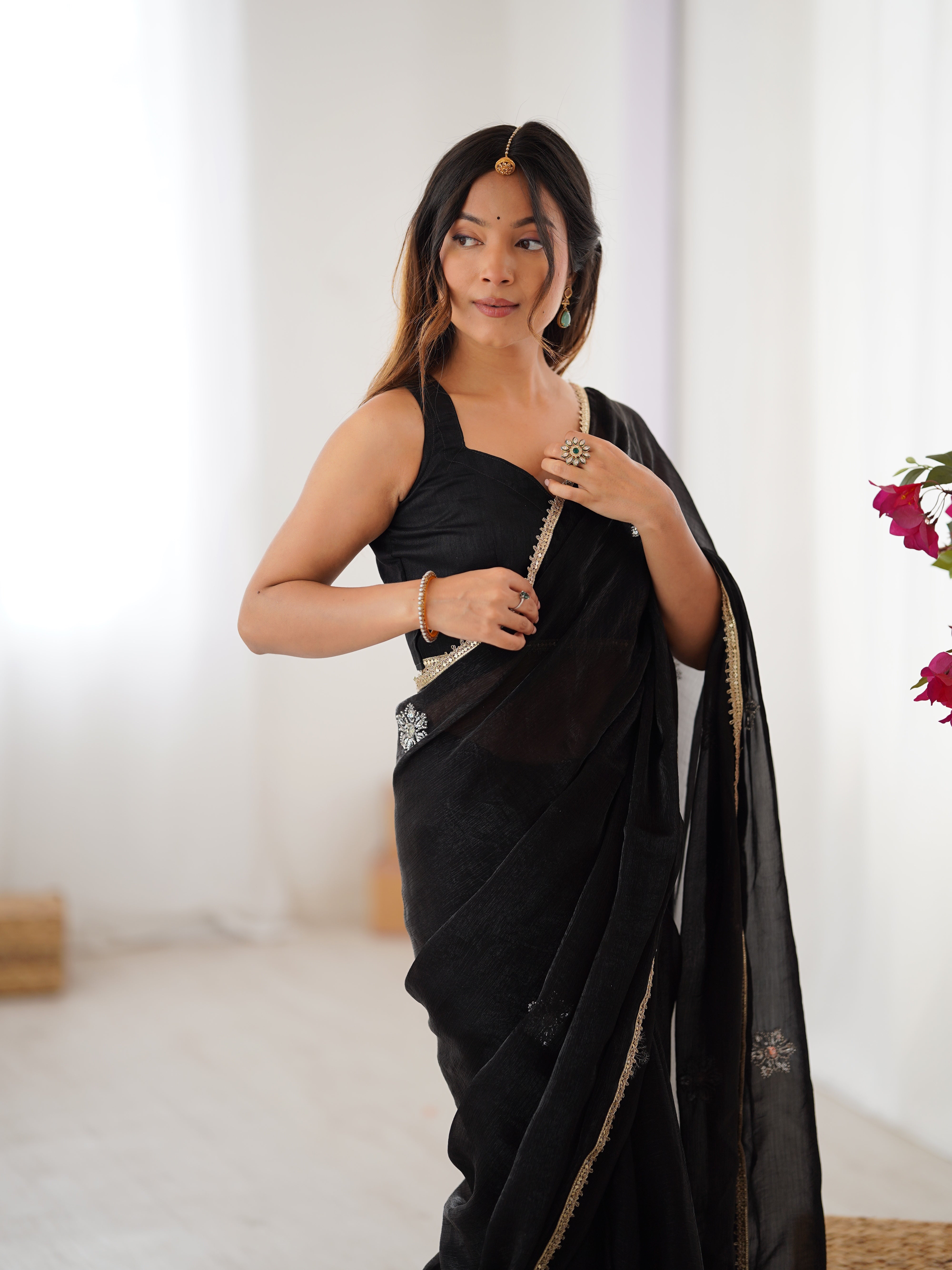 Step into refined beauty with our Star Black Georgette Saree. Designed for those who appreciate subtle glamour, this saree features scattered silver floral sequins embroidered across a soft black georgette canvas. The shimmering gold lace border adds just the right amount of festive shine, making it a go-to for evening celebrations and intimate gatherings alike.