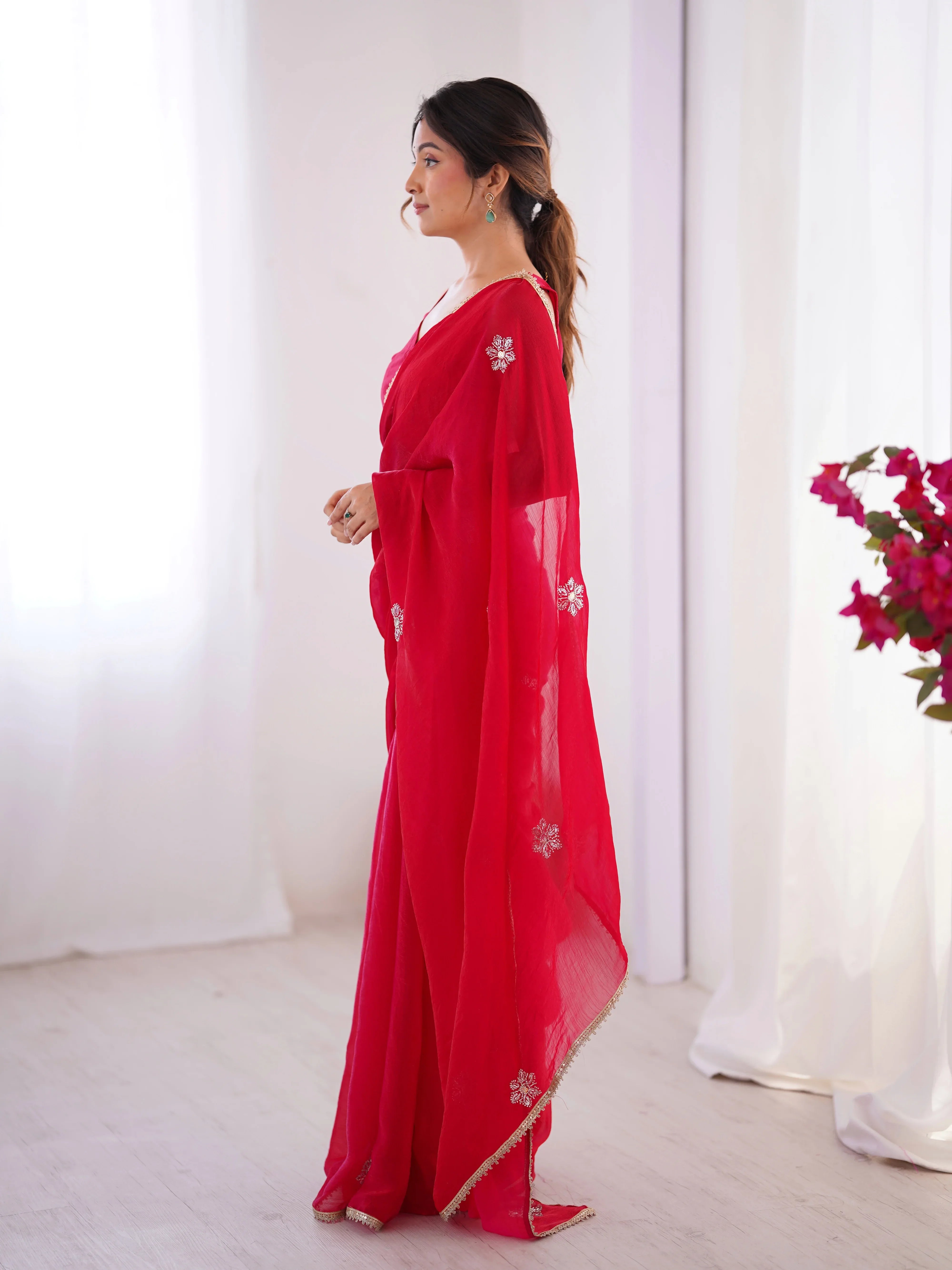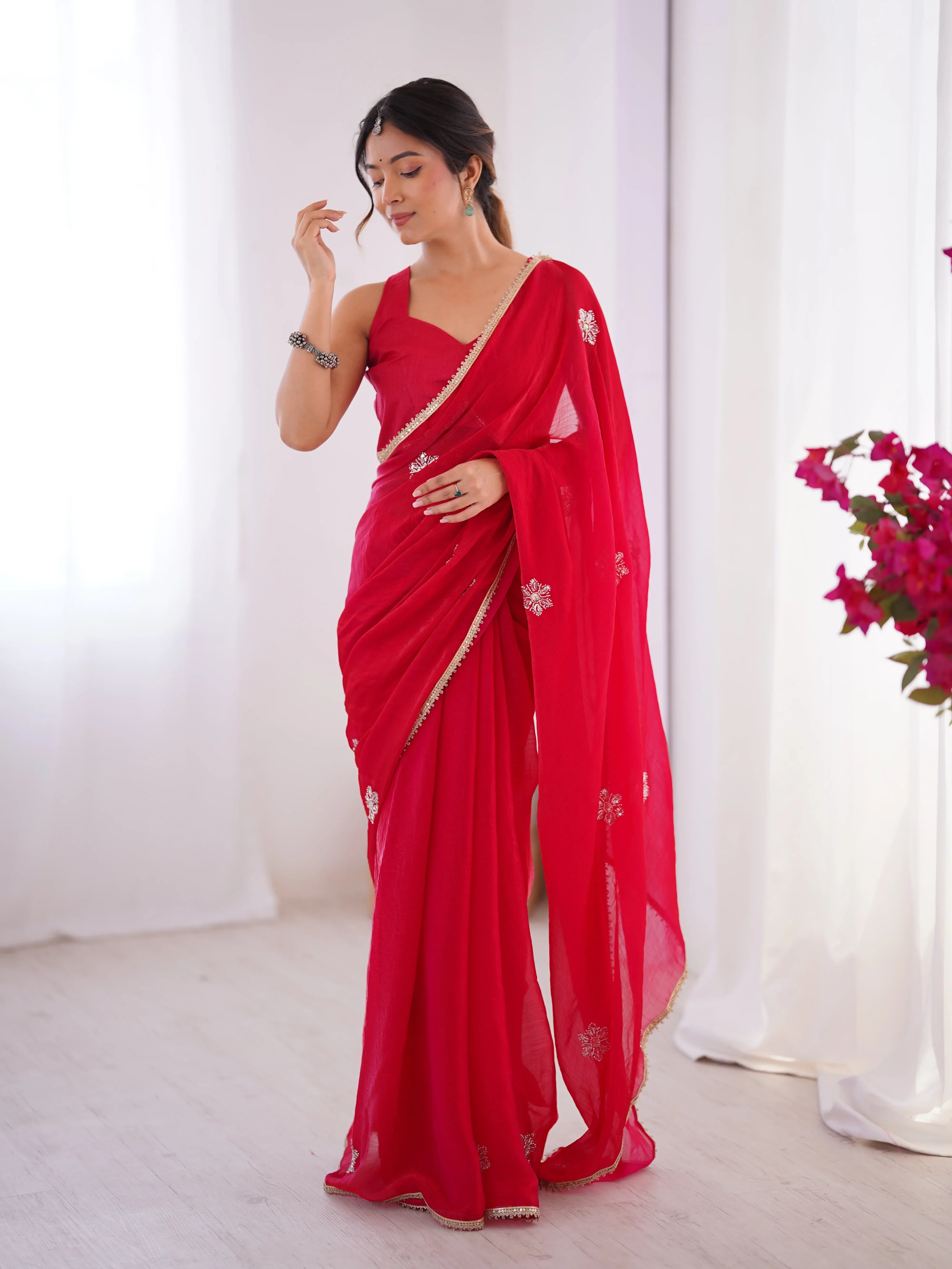 Step into refined beauty with our Star Red Georgette Saree. Designed for those who appreciate subtle glamour, this saree features scattered silver floral sequins embroidered across a soft Red georgette canvas. The shimmering gold lace border adds just the right amount of festive shine, making it a go-to for evening celebrations and intimate gatherings alike.