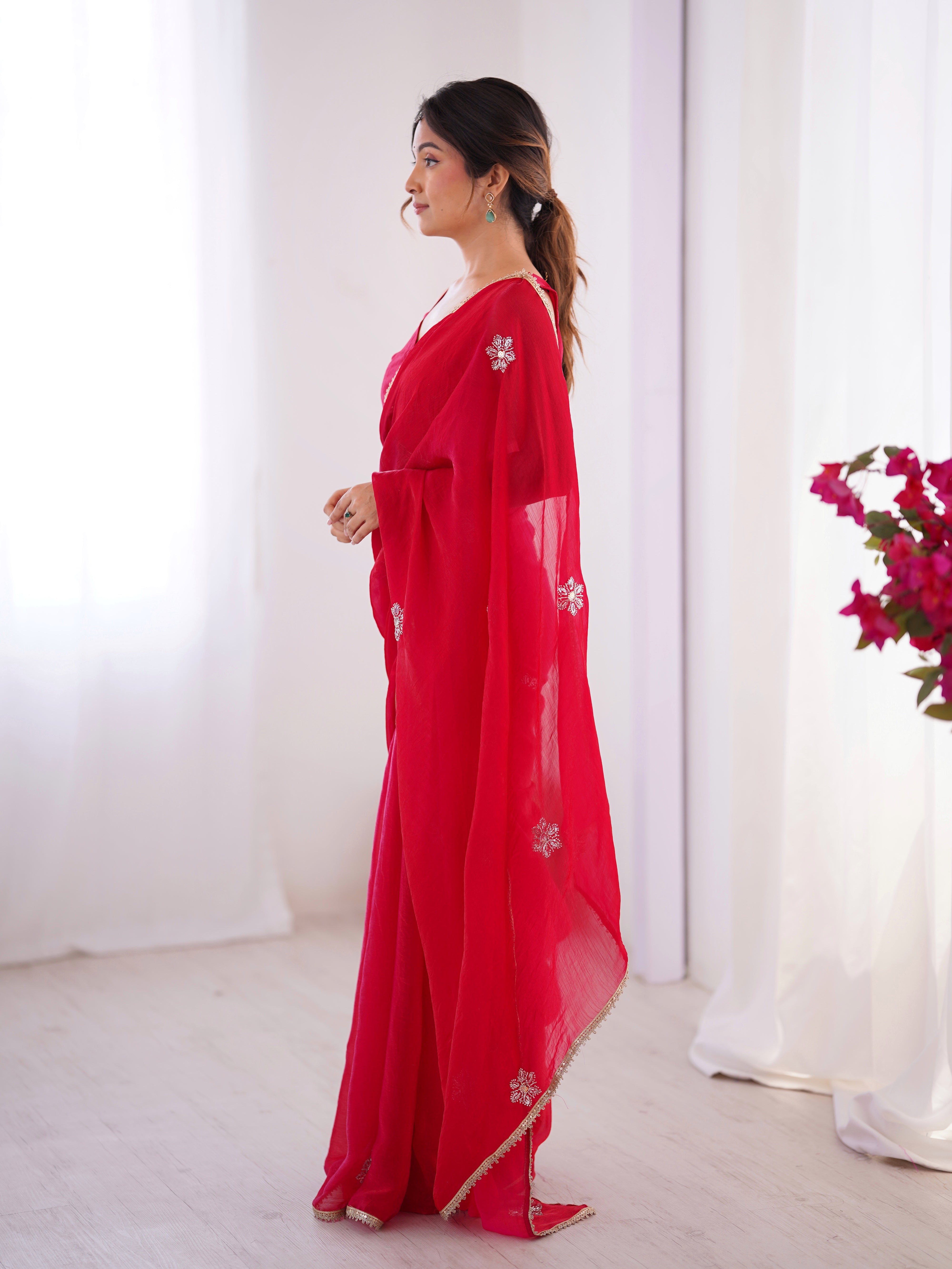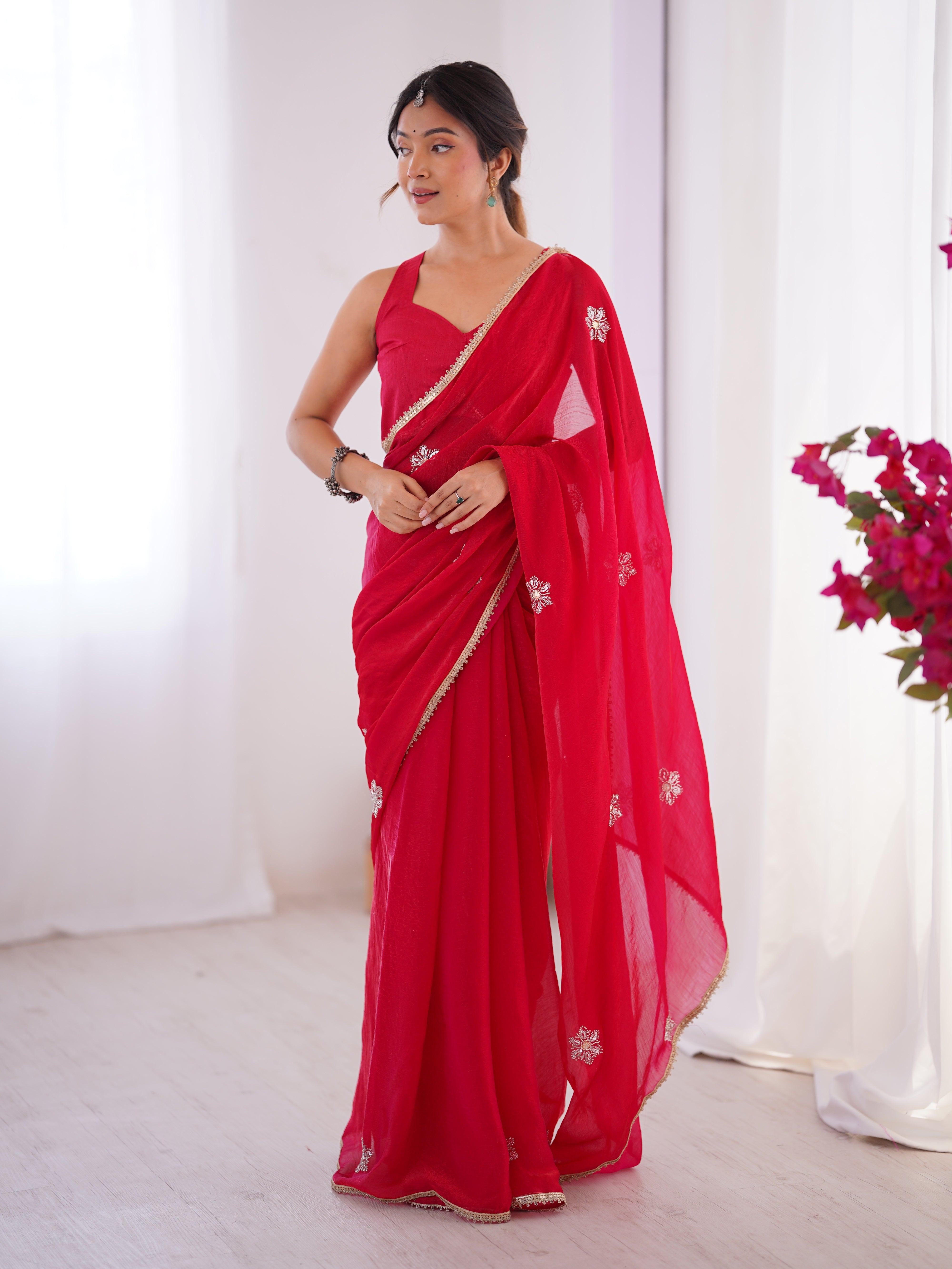 Step into refined beauty with our Star Red Georgette Saree. Designed for those who appreciate subtle glamour, this saree features scattered silver floral sequins embroidered across a soft Redย georgette canvas. The shimmering gold lace border adds just the right amount of festive shine, making it a go-to for evening celebrations and intimate gatherings alike.