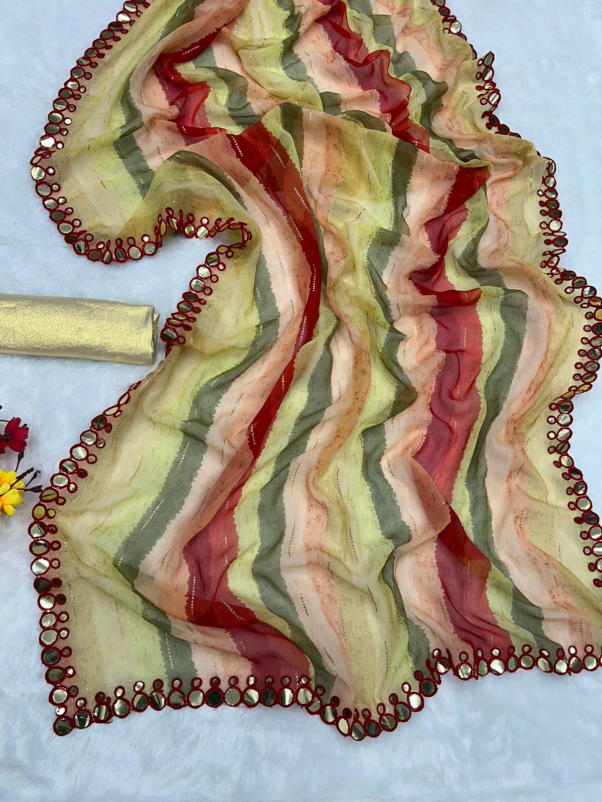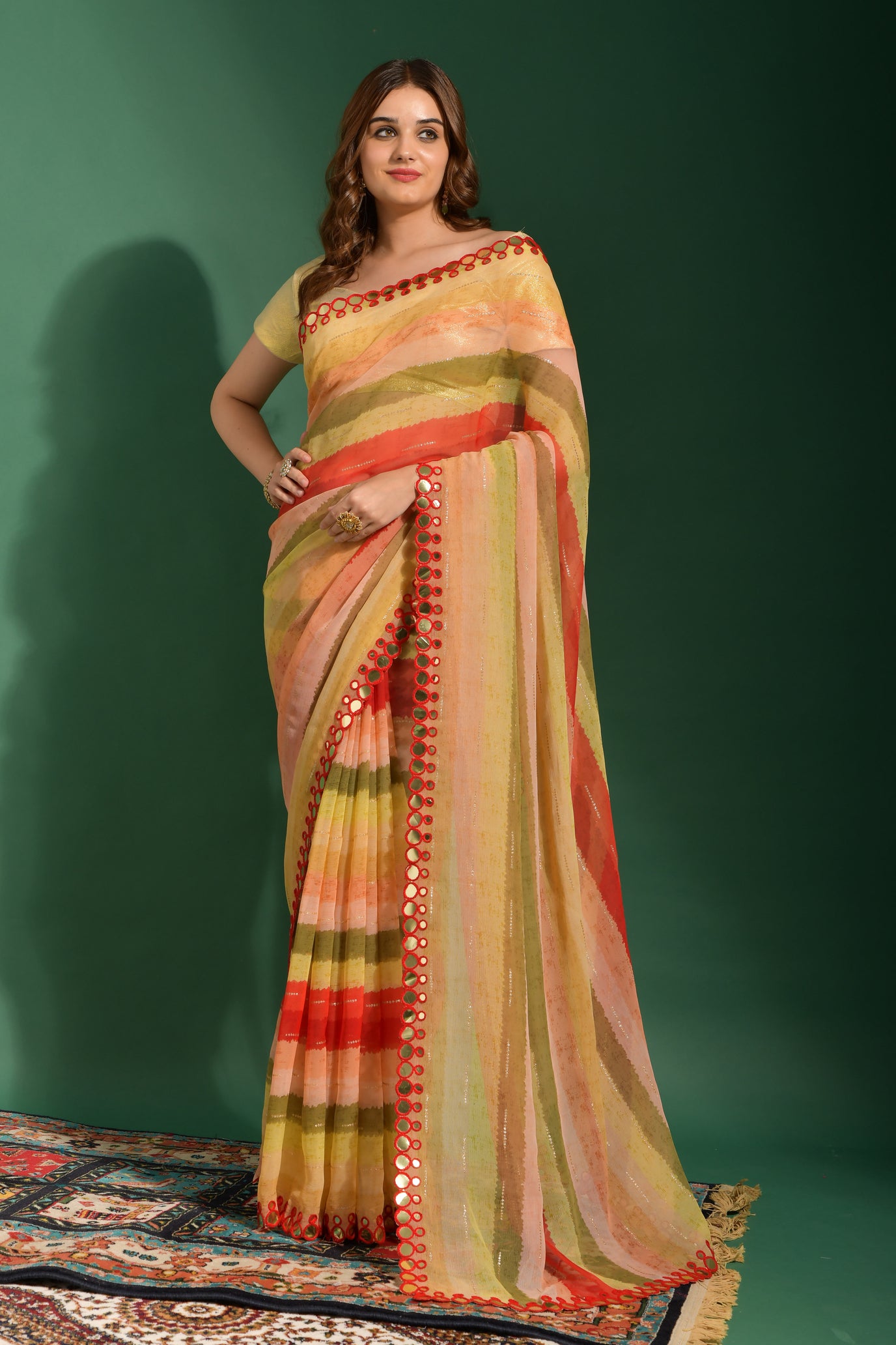 Infused with the rich warmth of sunset hues, the Sunset Radiance saree brings together shades of mustard, olive, coral, and red. The mirror-embroidered border in striking red adds just the right touch of traditional sparkle to your ensemble.