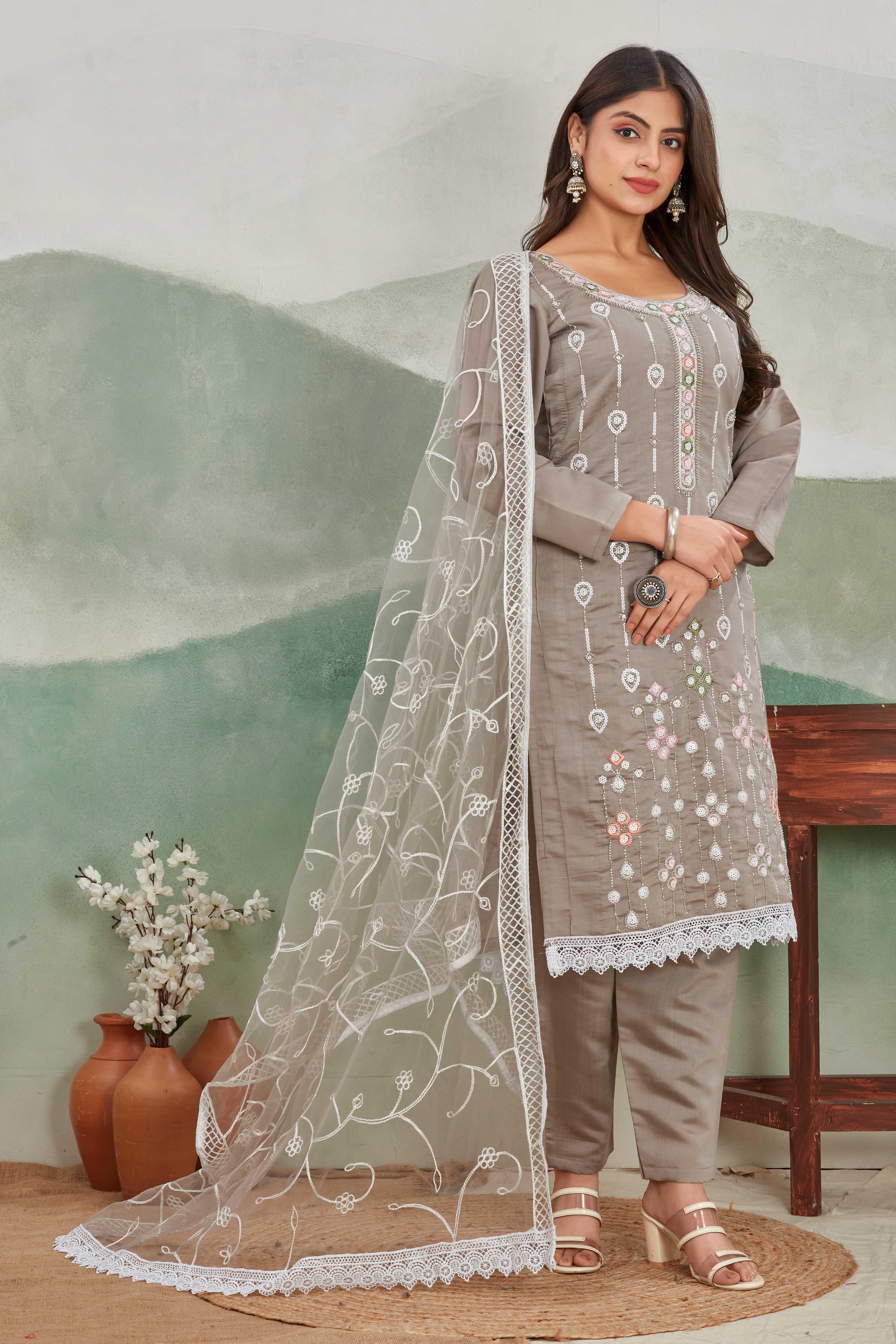 Graceful and versatile, this taupe embroidered salwar suit offers timeless charm with modern touches. Designed with intricate white thread and pastel sequin embroidery, the kurta features a front placket-style design paired with solid straight-fit bottoms. The delicate net dupatta with floral embroidery and lace trim completes the look.