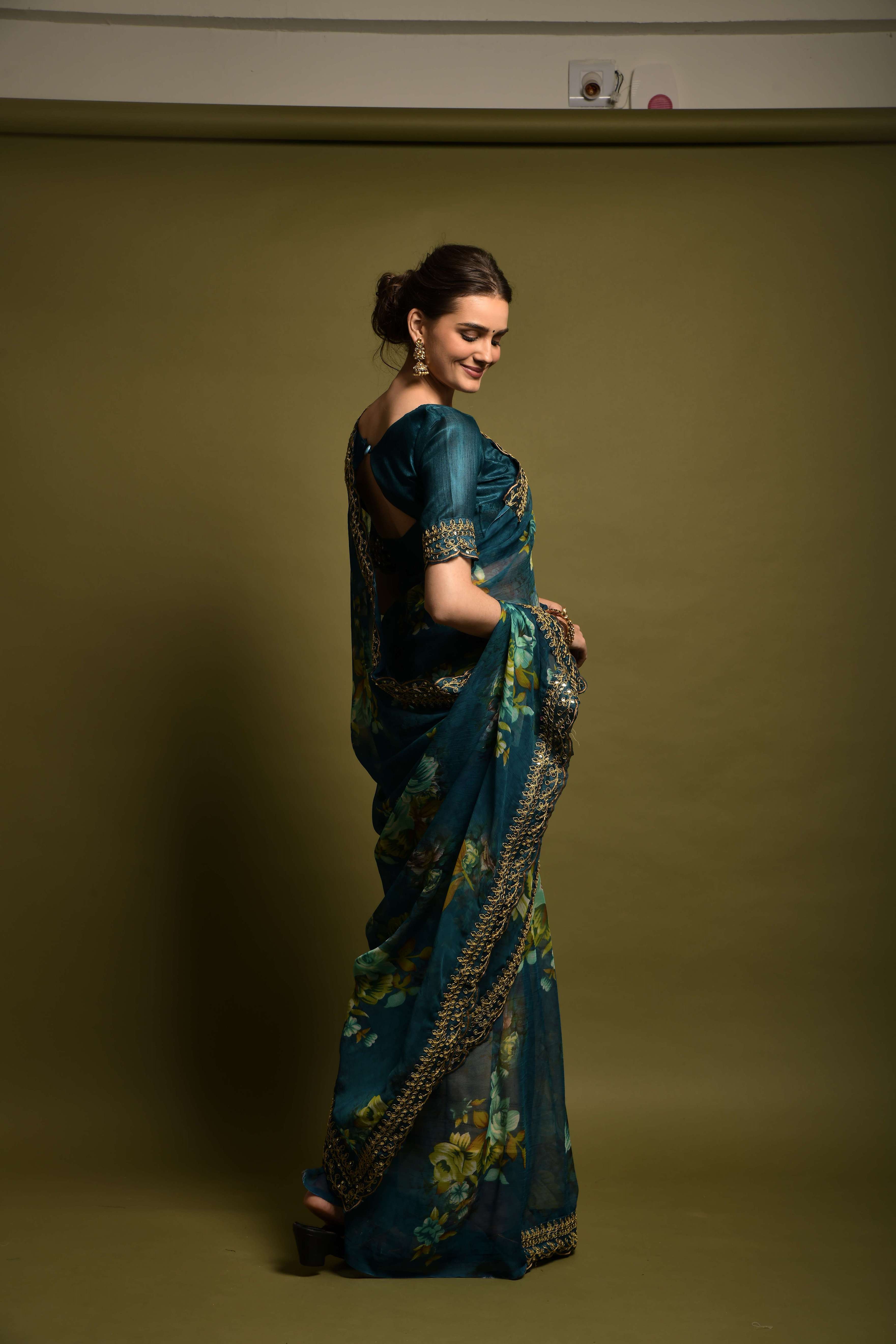 Step into timeless elegance with this teal blue floral georgette saree, featuring a stunning array of vibrant blossoms and a richly embroidered golden border. This saree offers the perfect blend of tradition and modern finesse for any festive or formal occasion.
