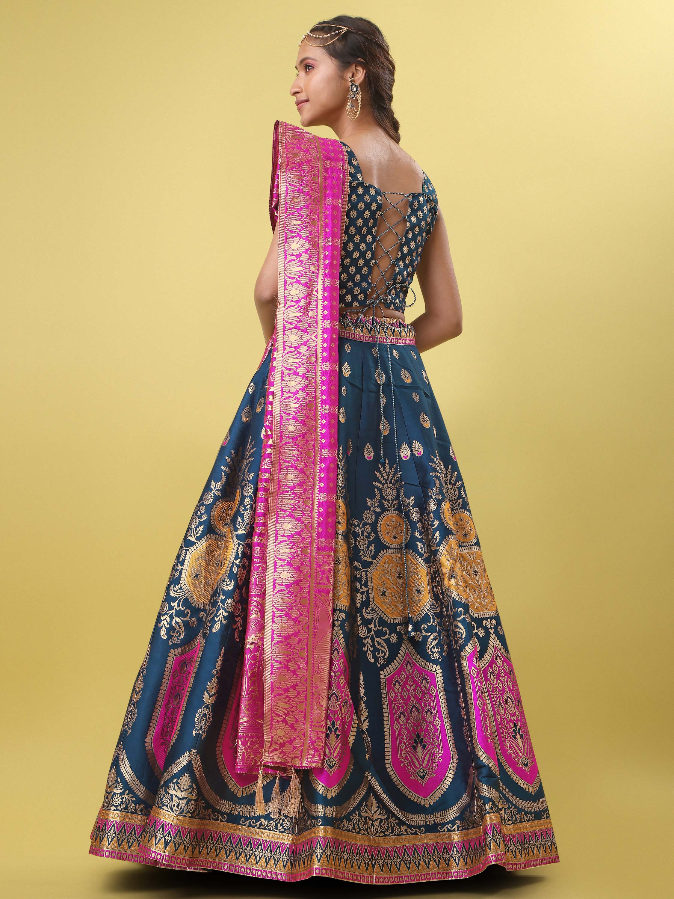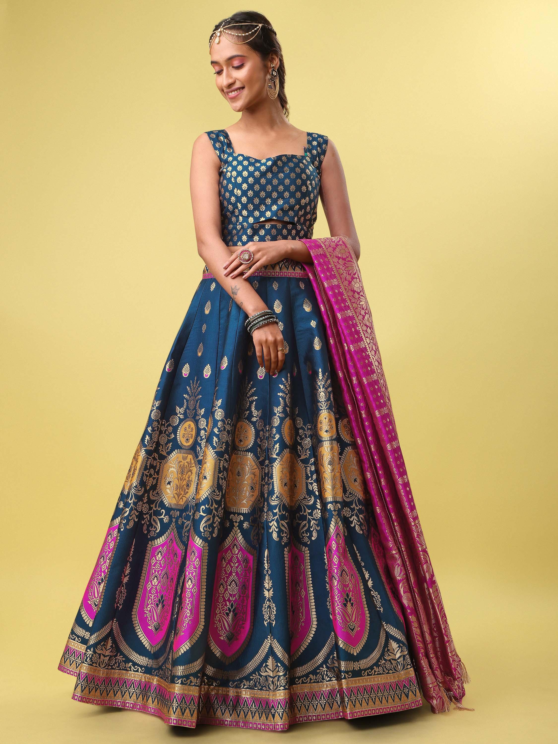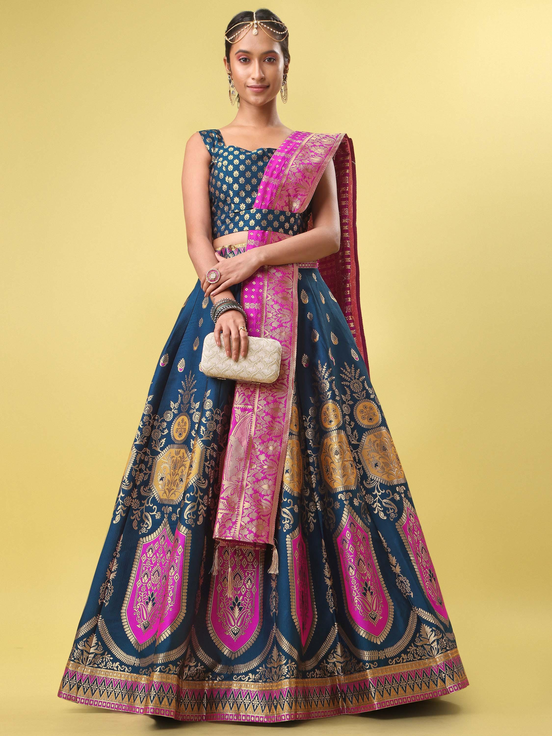Make a statement at weddings and festive celebrations with this exquisite Teal Blue Banarasi Silk Lehenga Set. Crafted with intricate gold zari motifs and highlighted by rich magenta accents, this ensemble blends timeless tradition with contemporary elegance.The lehenga features elaborate woven patterns along the hem, paired with a structured sleeveless blouse for a refined silhouette. A contrasting magenta dupatta with gold detailing completes the look, adding a regal touch perfect for grand occasions.