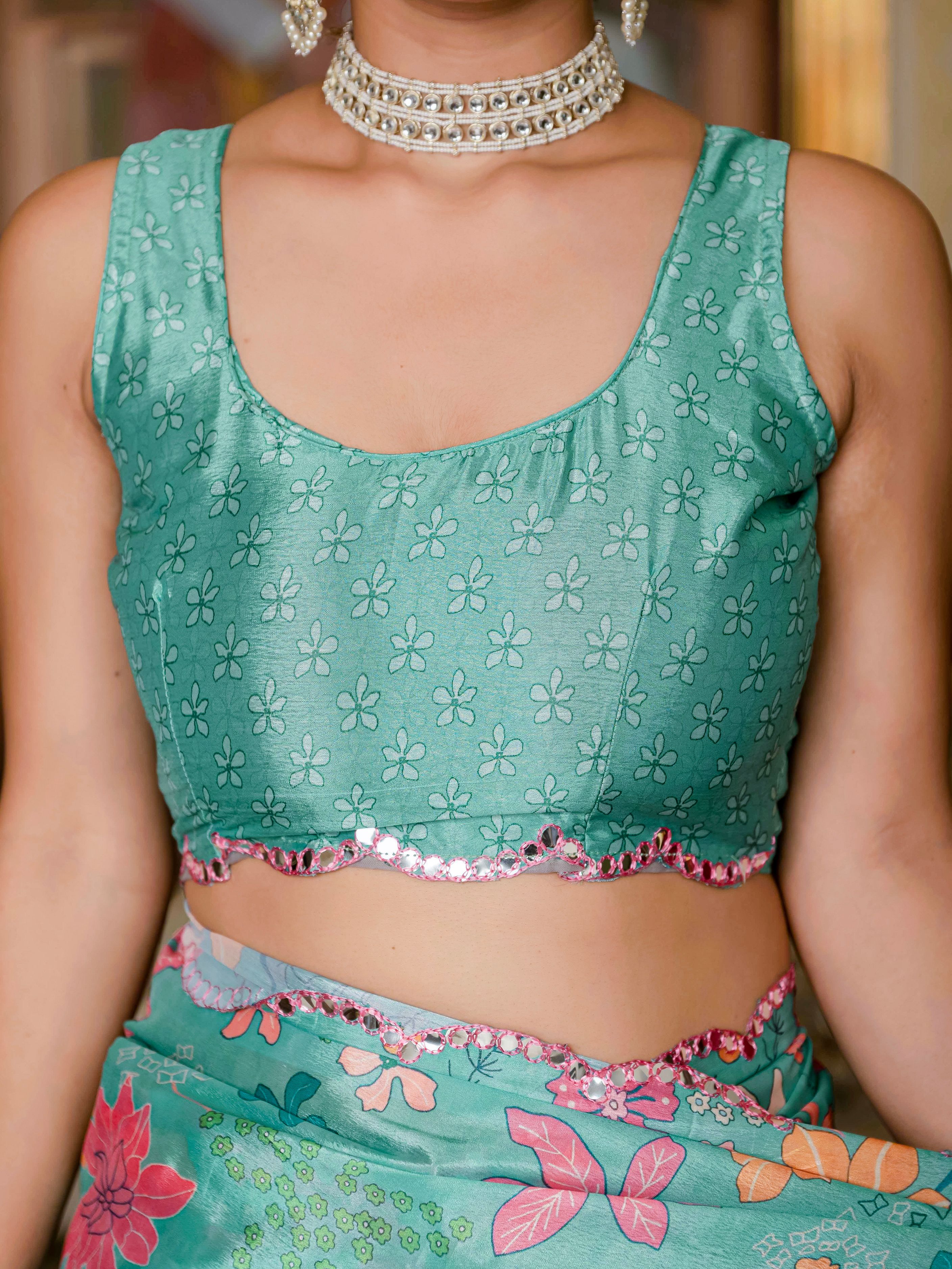 Step into effortless elegance with this beautifully crafted teal green floral printed Ready To Wear saree. Designed for modern women who love tradition without the hassle, this pre-stitched saree offers a flawless drape in minutes. Adorned with vibrant floral motifs and finished with a delicate scalloped embellished border, the saree exudes regal charm. The lightweight, flowy fabric ensures comfort while maintaining a graceful silhouette, making it ideal for weddings, festive occasions, and special celebrations. Just slip it on, zip it up, and you’re ready to shine.