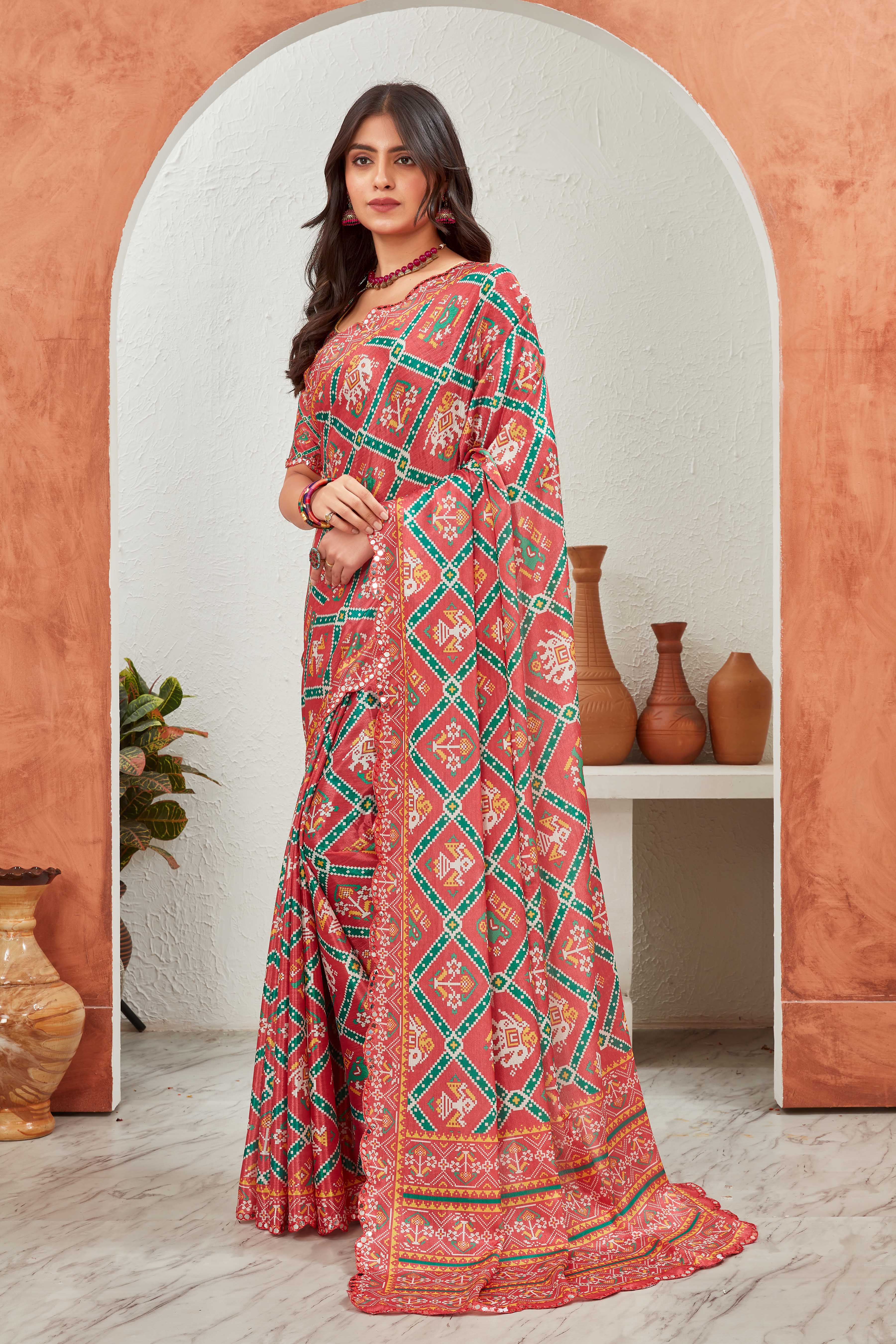 Make a bold ethnic statement with this vibrant red saree adorned with green and mustard traditional geometric patterns. The all-over print and symmetrical design give it a timeless charm, making it a great pick for festive events and cultural gatherings.