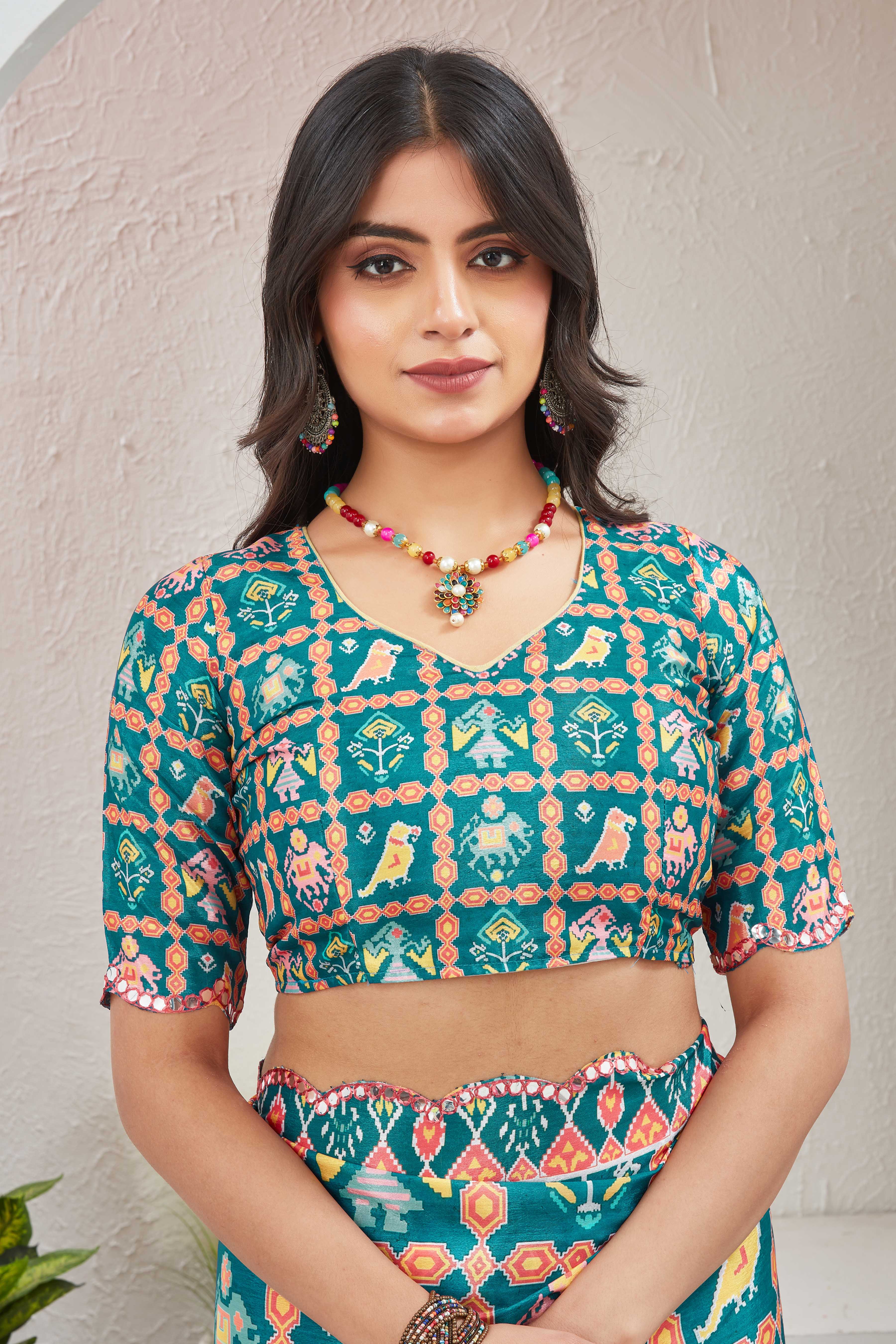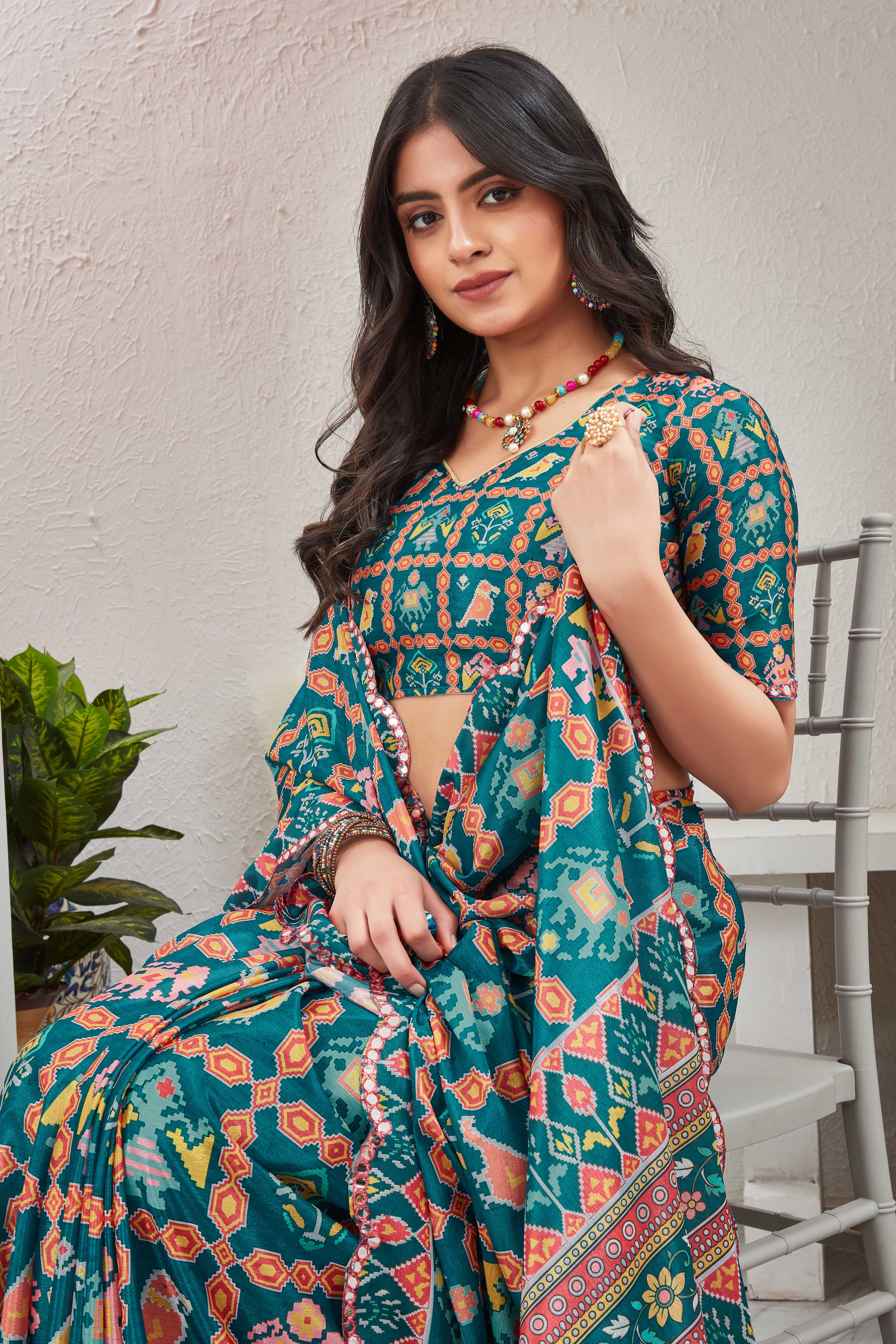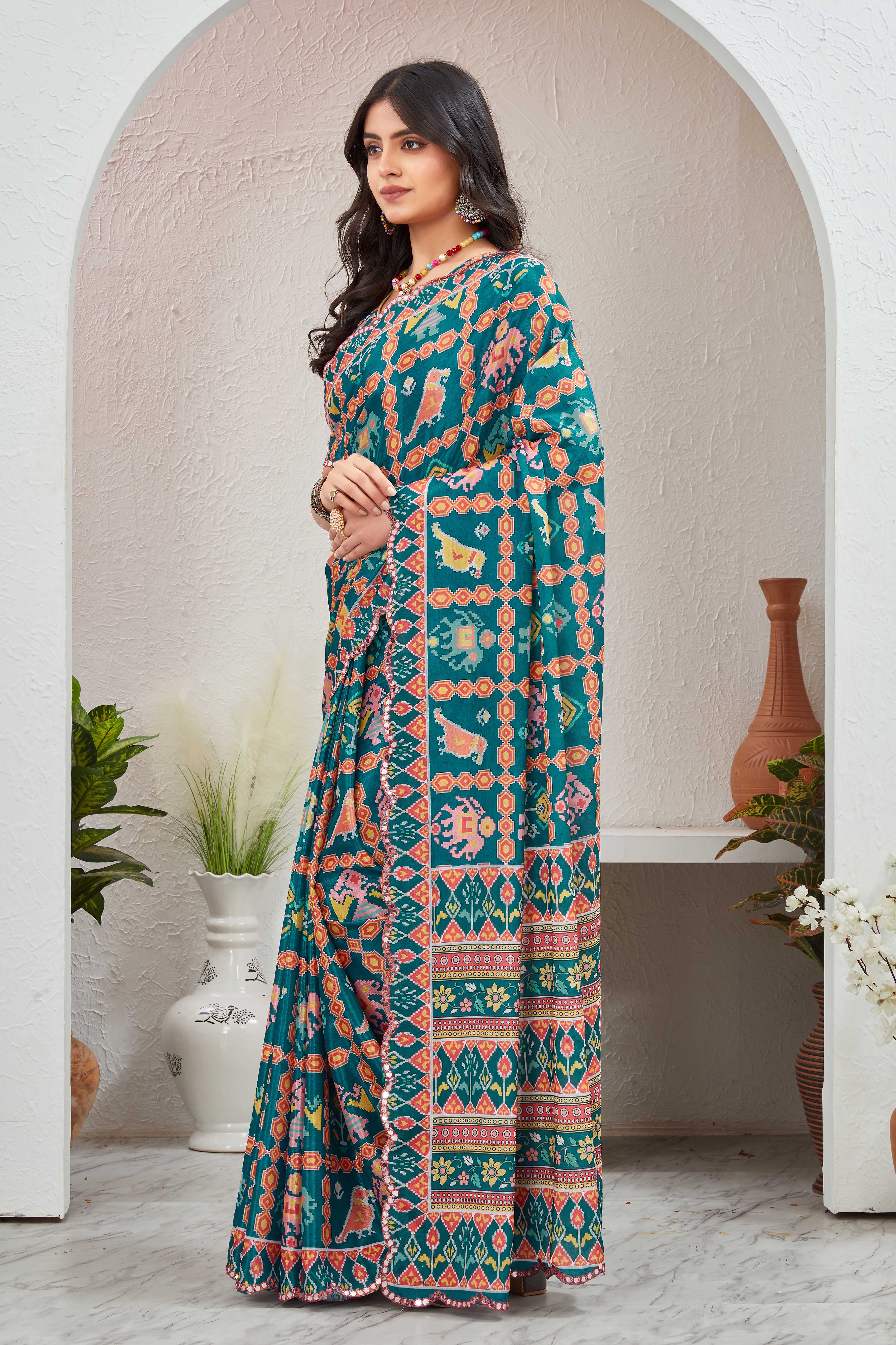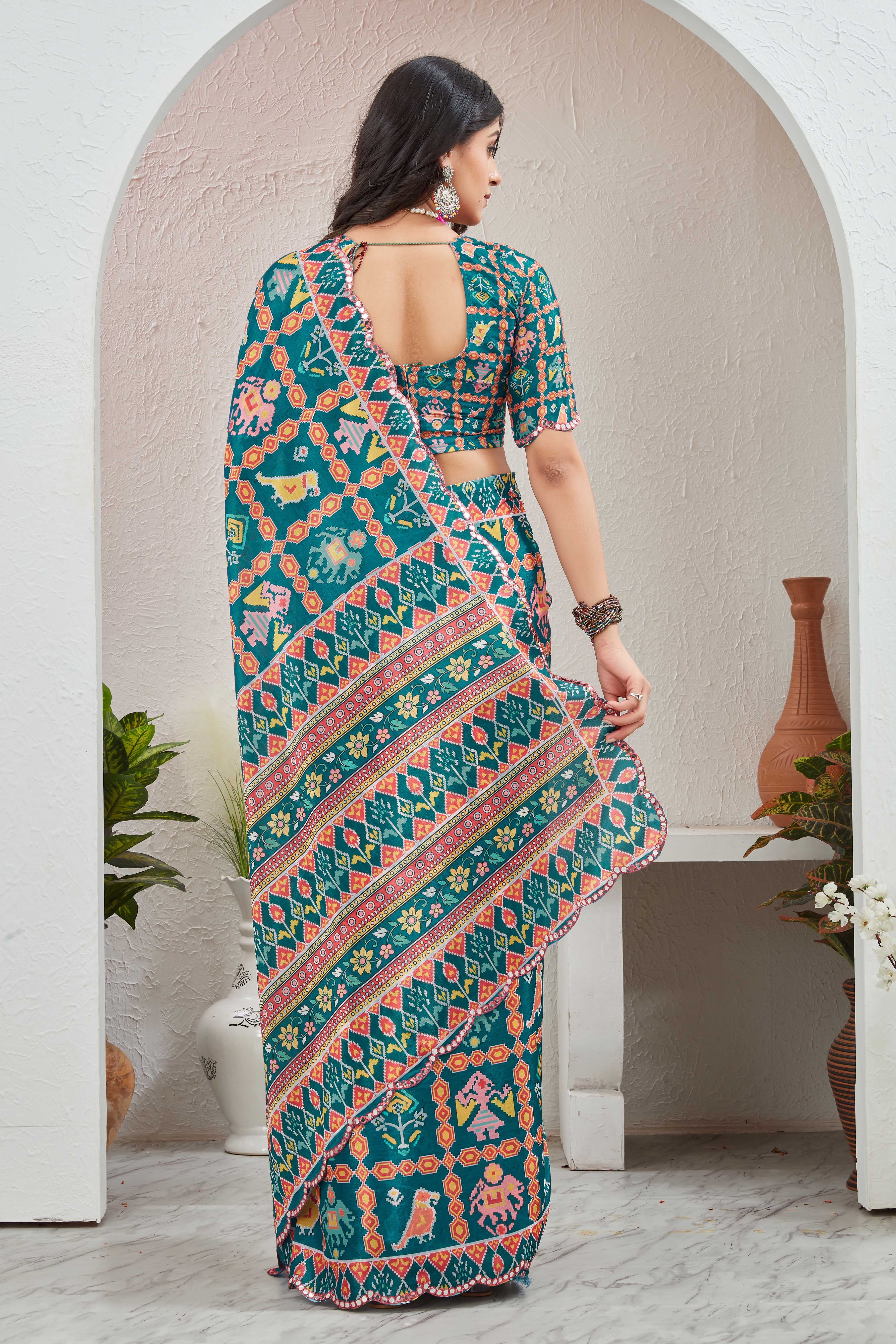 Step into timeless elegance with this stunning Patola print saree in a rich teal base. Adorned with intricate traditional motifs in vibrant shades of red, yellow, pink, and green, this saree is a beautiful expression of cultural heritage and artistic detailing.