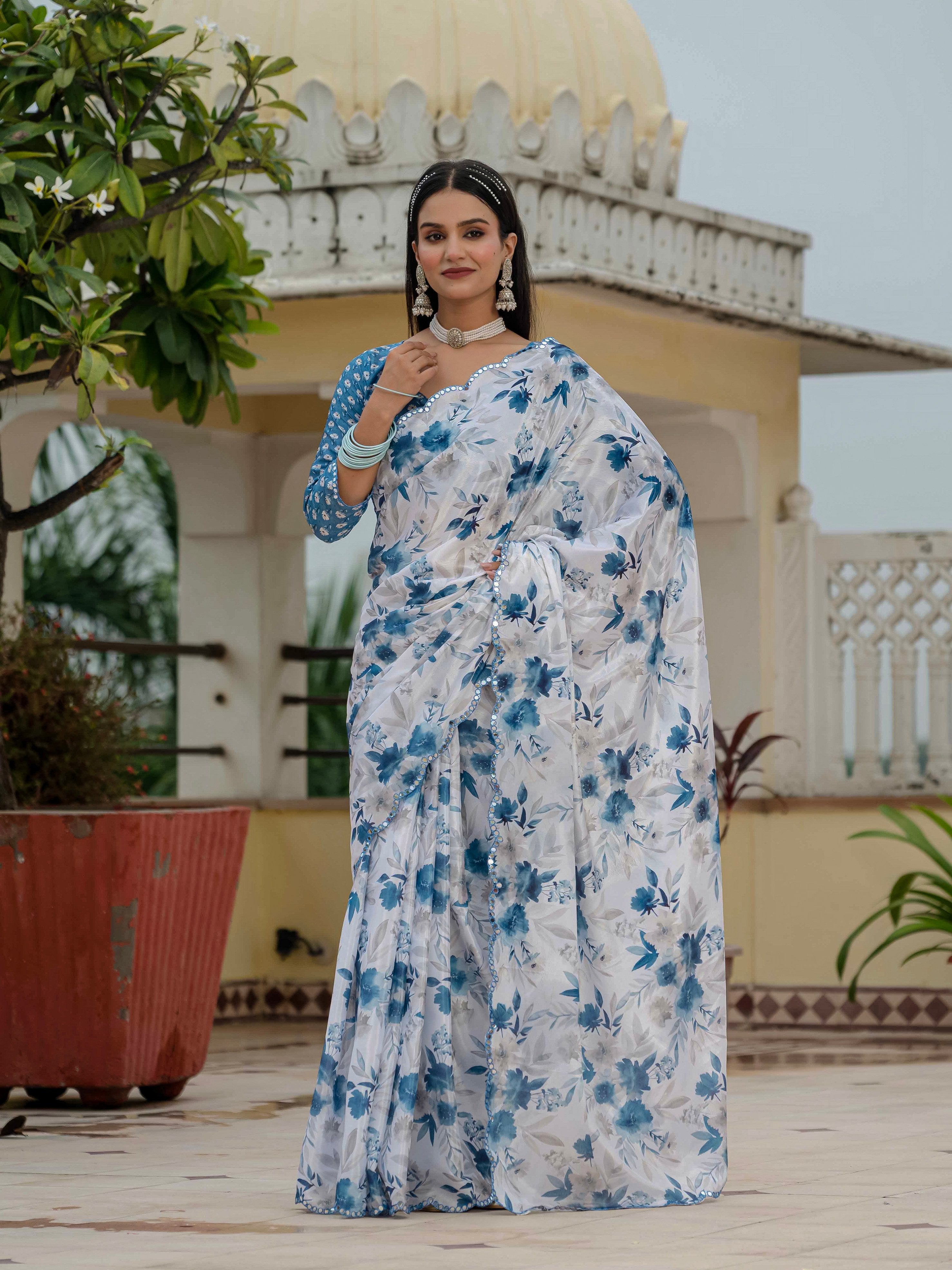 White & Blue Floral Printed Ready To Wear Saree with Scalloped Border