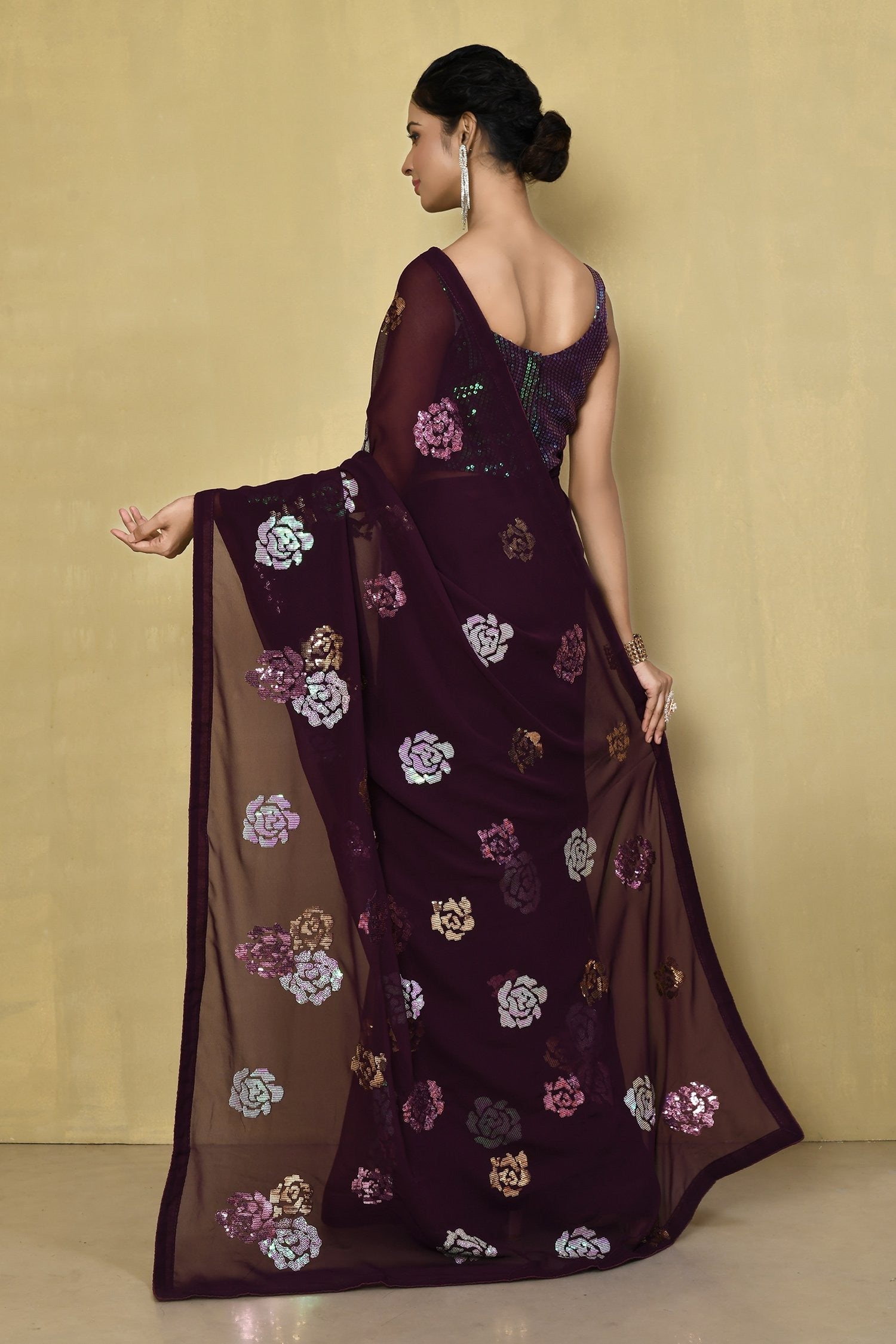 Drape yourself in elegance with this stunning Wine Designer Saree, beautifully adorned with large floral sequins in gold, pink, and burgundy tones. The sheer Georgette base enhances the saree’s regal look, making it ideal for weddings, receptions, and festive galas.