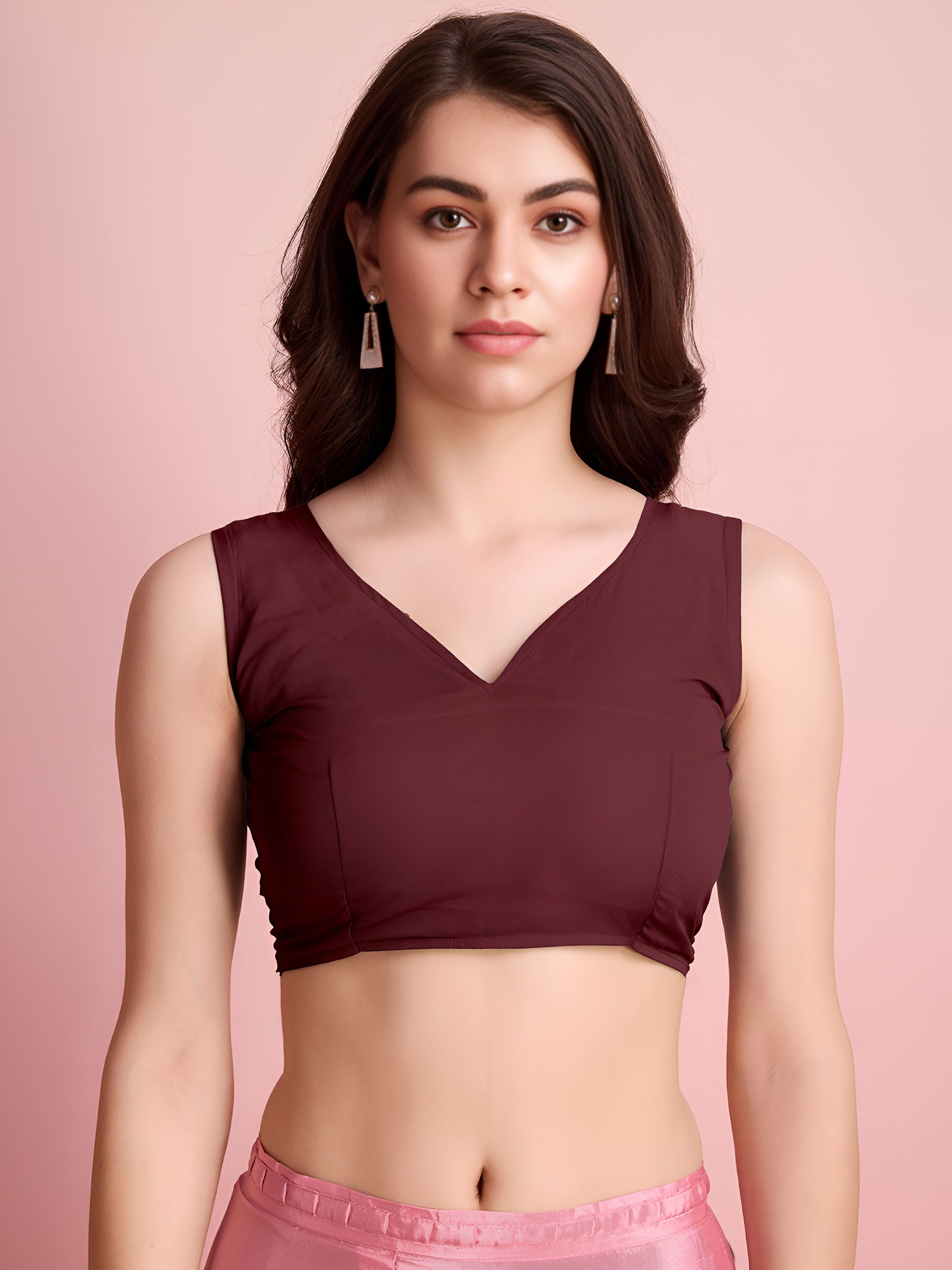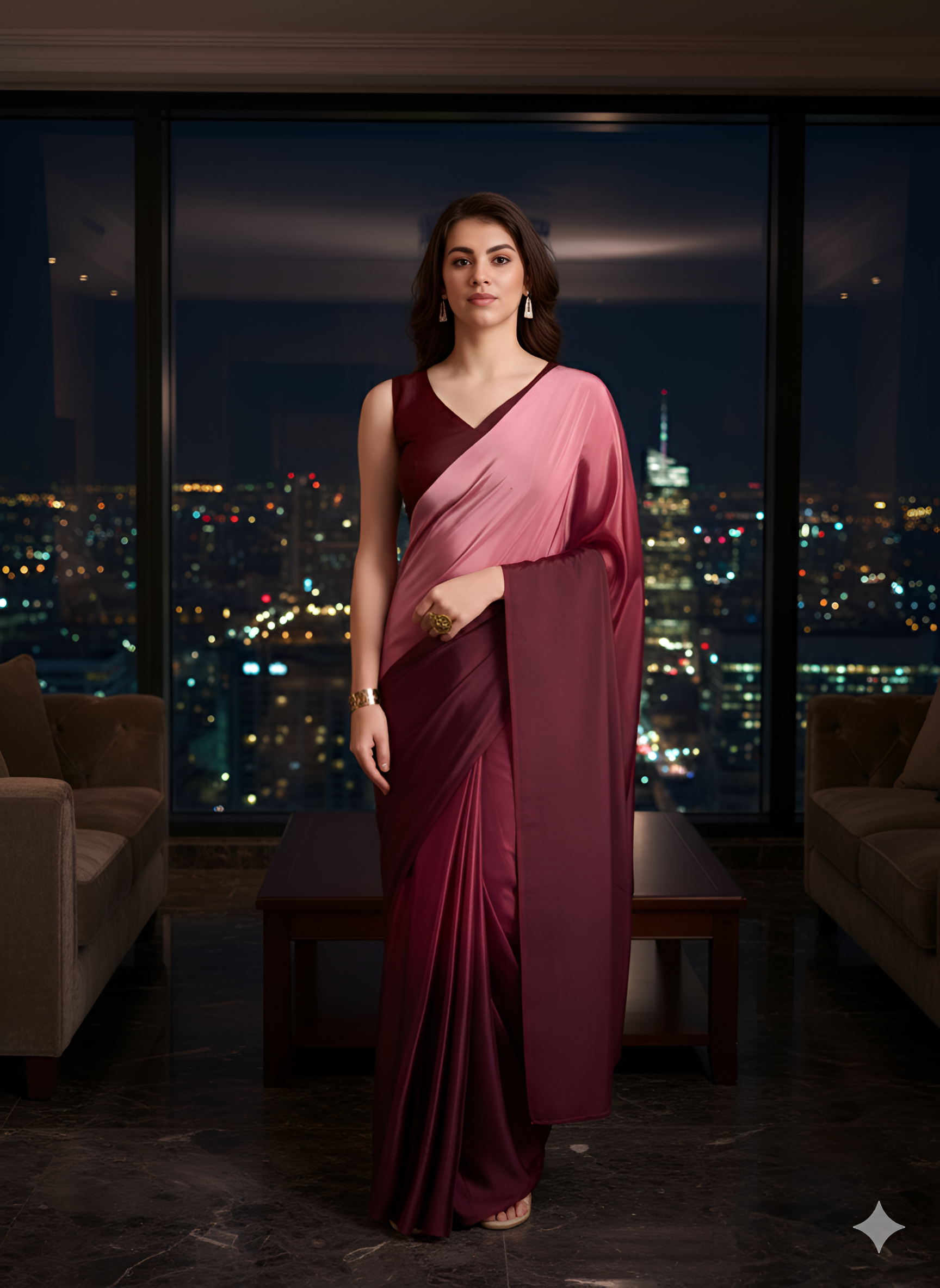 Make a timeless style statement with this elegant emerald Wine satin silk Ready to Wear saree. Designed with a smooth, lustrous finish, this saree drapes effortlessly and exudes understated luxury. The rich green hue is complemented by a contemporary sleeveless blouse featuring subtle textured detailing, making it perfect for modern festive dressing. Ideal for evening occasions, celebrations, and elegant gatherings, this saree is a versatile addition to any refined wardrobe.