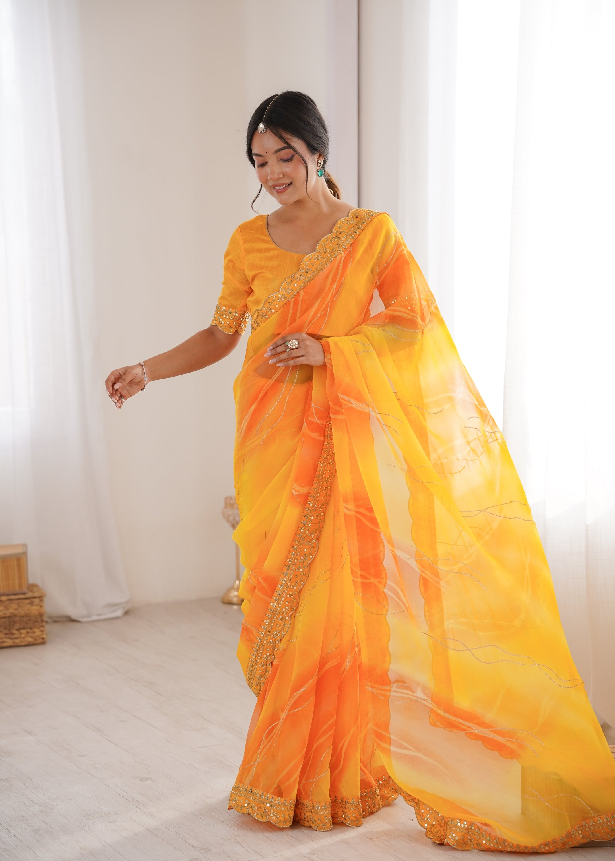 Step into effortless elegance with this Yellow Georgette Chiffon saree, designed to capture grace in every movement. The sheer, lightweight fabric is beautifully accentuated with delicate gold embroidery along the border, adding a refined festive touch. Subtle woven patterns across the saree enhance its charm, while the flowy pallu creates a soft, ethereal silhouette. Paired with a matching blouse featuring coordinated embroidery, this saree is perfect for festive occasions, weddings, and sophisticated daytime celebrations.