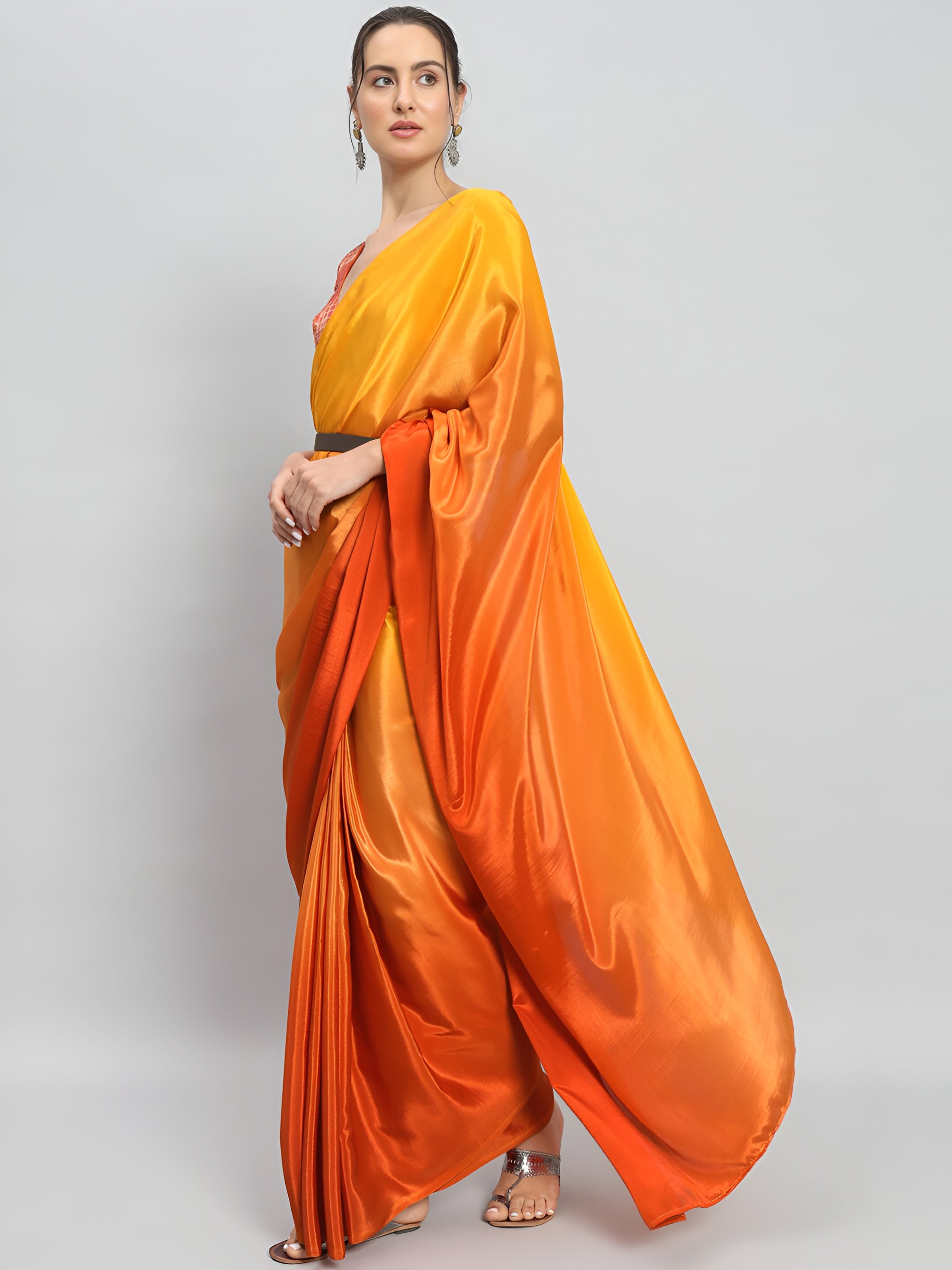 Make a timeless style statement with this elegant emerald Teal Blue satin silk Ready to Wear saree. Designed with a smooth, lustrous finish, this saree drapes effortlessly and exudes understated luxury. The rich green hue is complemented by a contemporary sleeveless blouse featuring subtle textured detailing, making it perfect for modern festive dressing. Ideal for evening occasions, celebrations, and elegant gatherings, this saree is a versatile addition to any refined wardrobe.