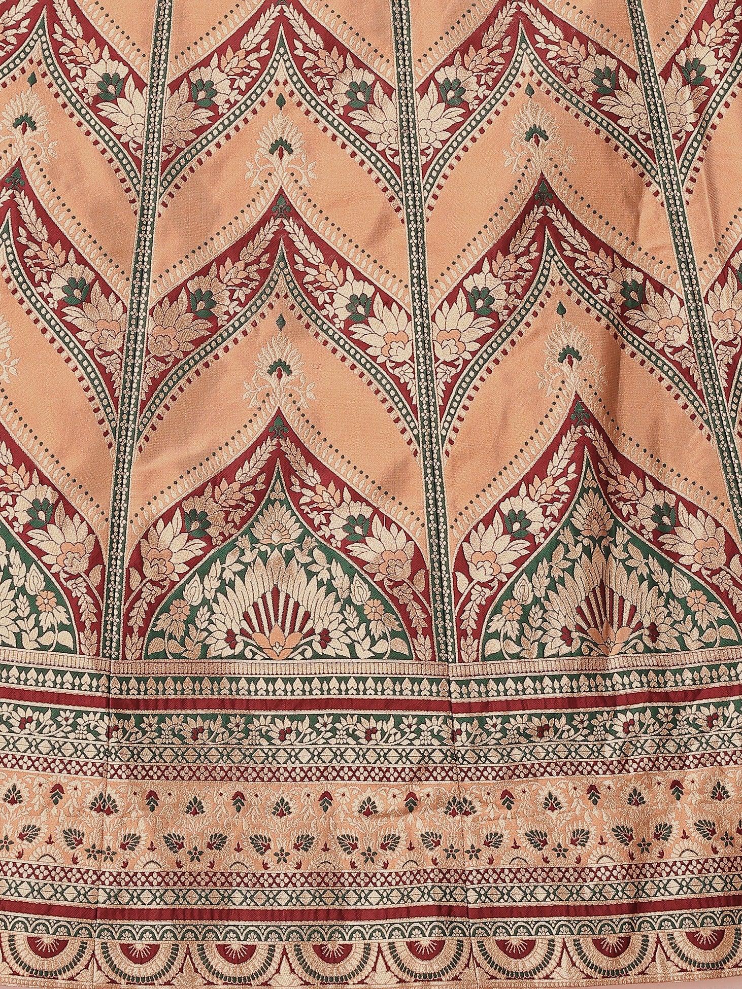 Channel timeless tradition with this stunning Zayna Beige & Maroon Banarasi Silk Lehenga Set. Crafted in rich silk fabric, the lehenga features vintage-inspired antique gold zari weaving in intricate motifs, perfectly matched with a deep maroon dupatta adorned with luxurious brocade borders. The modest yet elegant styling makes it a perfect choice for weddings, engagements, or cultural festivities.